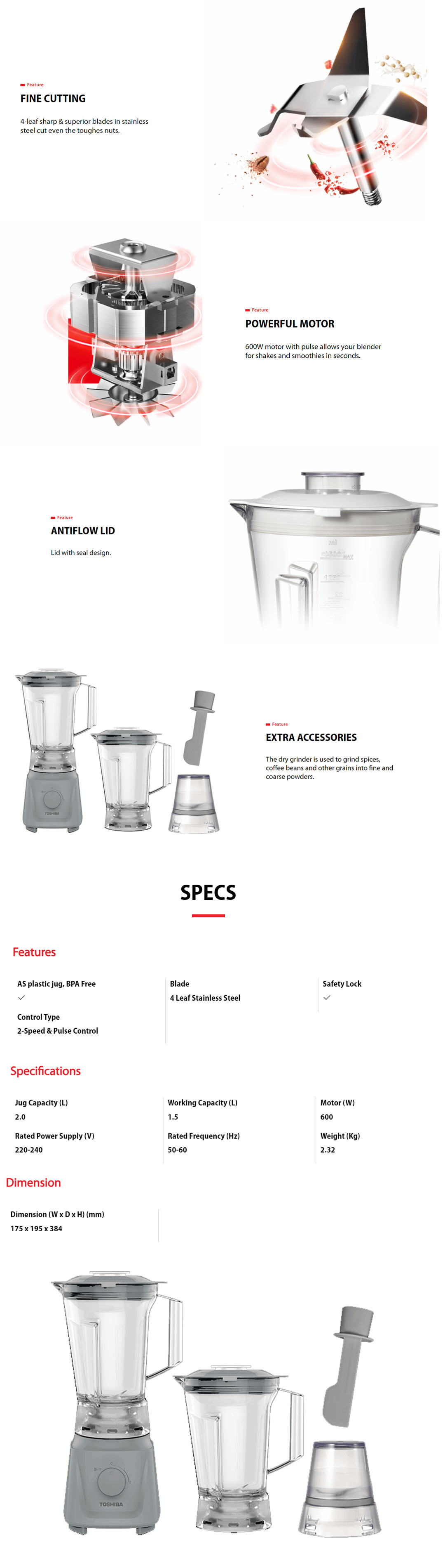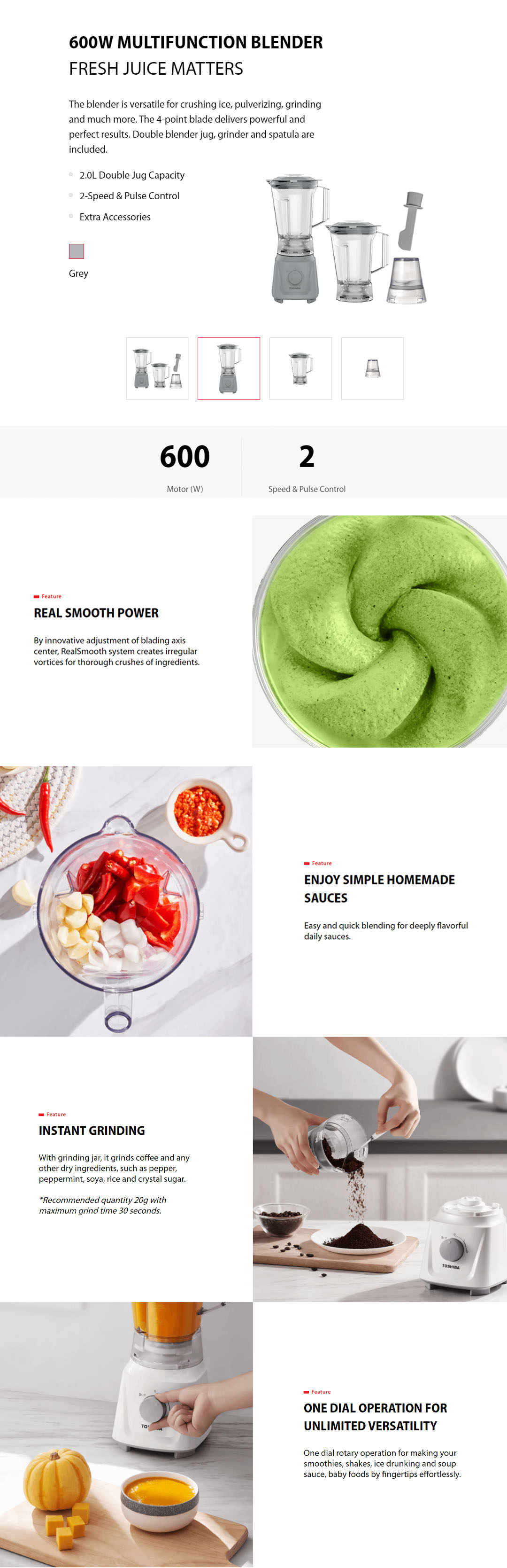 TOSHIBA 2L Multifunction Blender BL-60PH3TMY(H) | Real Smooth Power | Instant Grinding | Powerful Motor : 600W | Blender with 1 Year Warranty