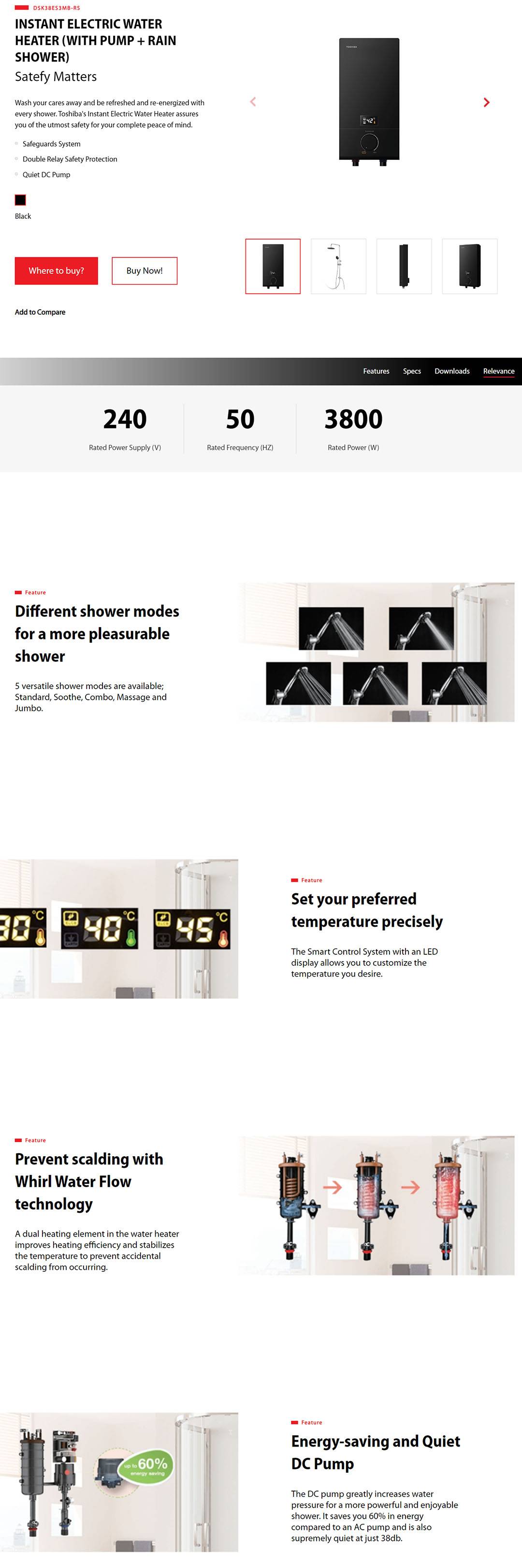 TOSHIBA 3800W DC Pump Instant Water Heater with Rain Shower DSK38ES3MB-RS | Energy-saving and Quiet DC Pump | 5 Versatile Shower Mode | Water Heater with 1 Year Warranty
