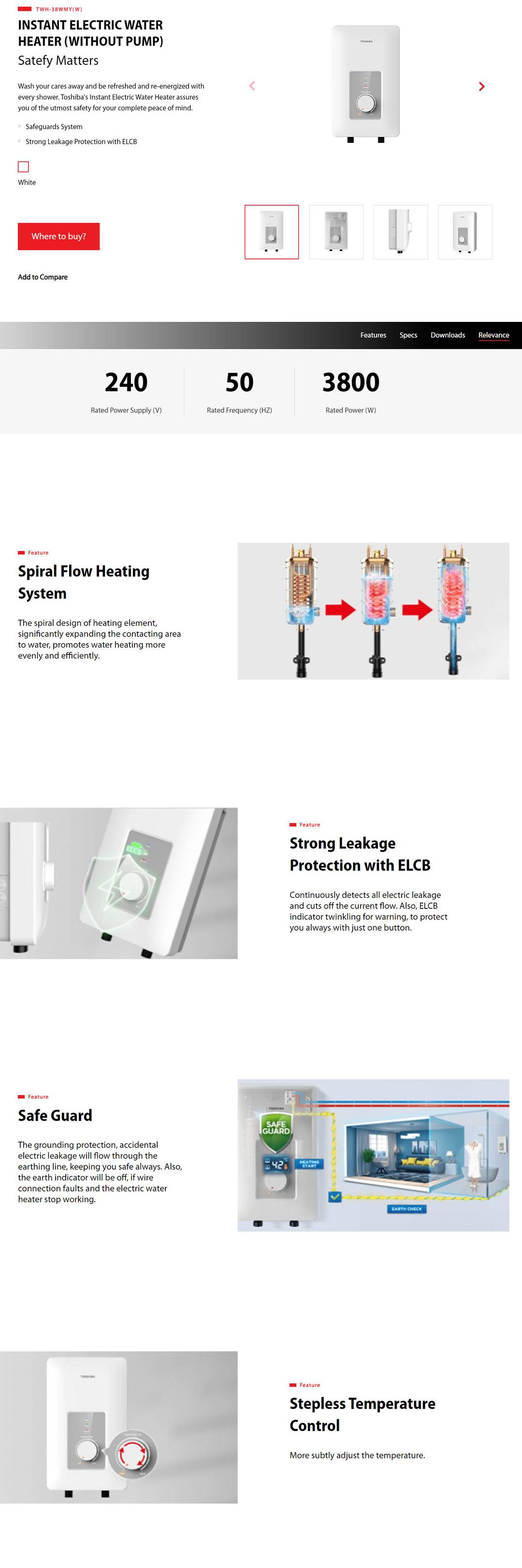 TOSHIBA 3800W Instant Electric Water Heater TWH-38WMY(W) | Spiral Flow Heating System | Protection with ELCB | Water Heater with 1 Year Warranty