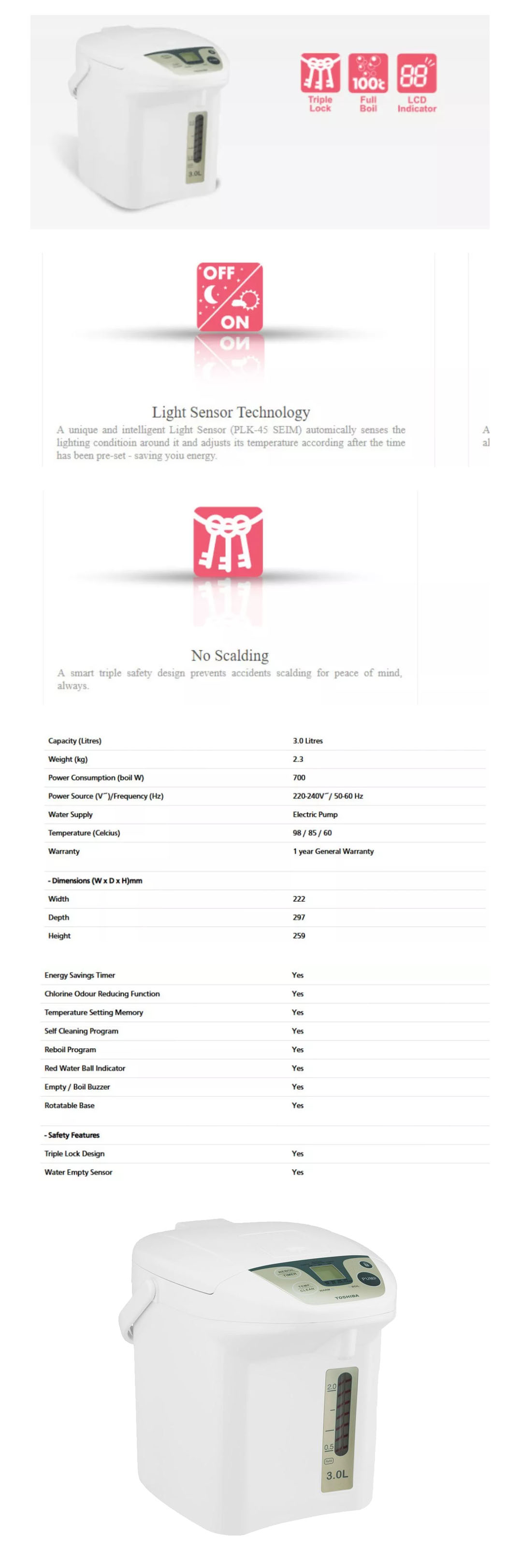 TOSHIBA 3L Thermopot PLK-30FLIM(WT) | Light Sensor Technology | No Scalding | Thermopot with 1 Year Warranty