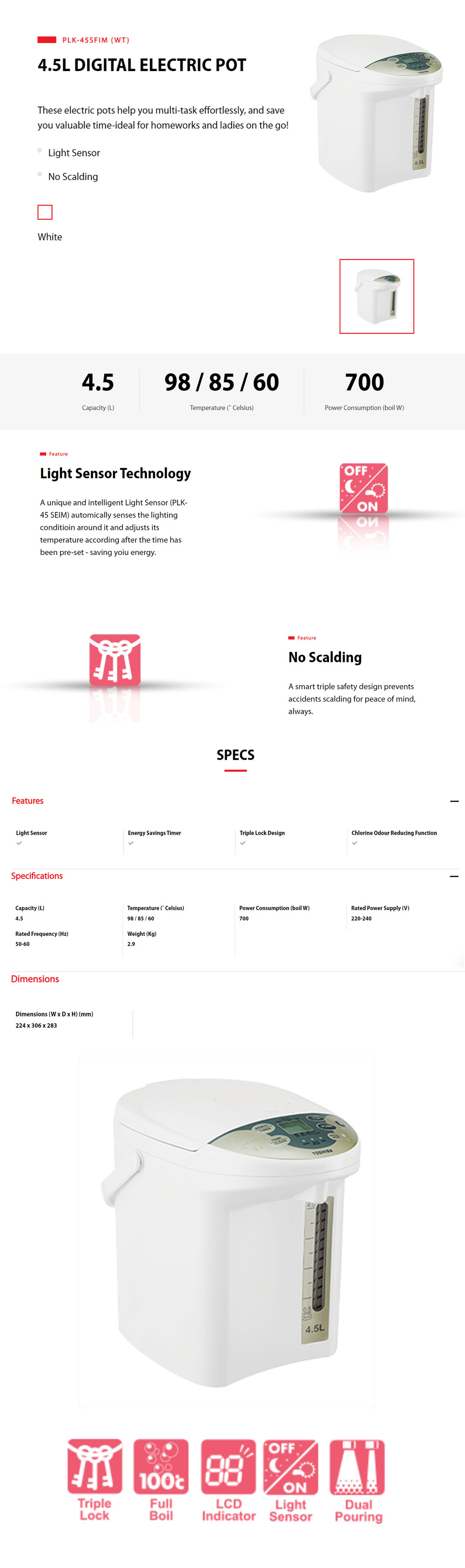 TOSHIBA 4.5L Thermopot PLK-45SFIM(WT) | Light Sensor Technology | No Scalding | Thermopot with 1 Year Warranty