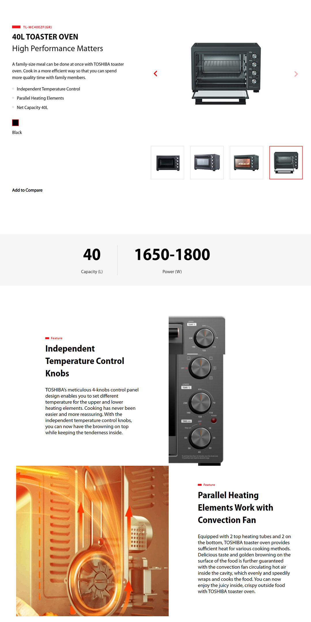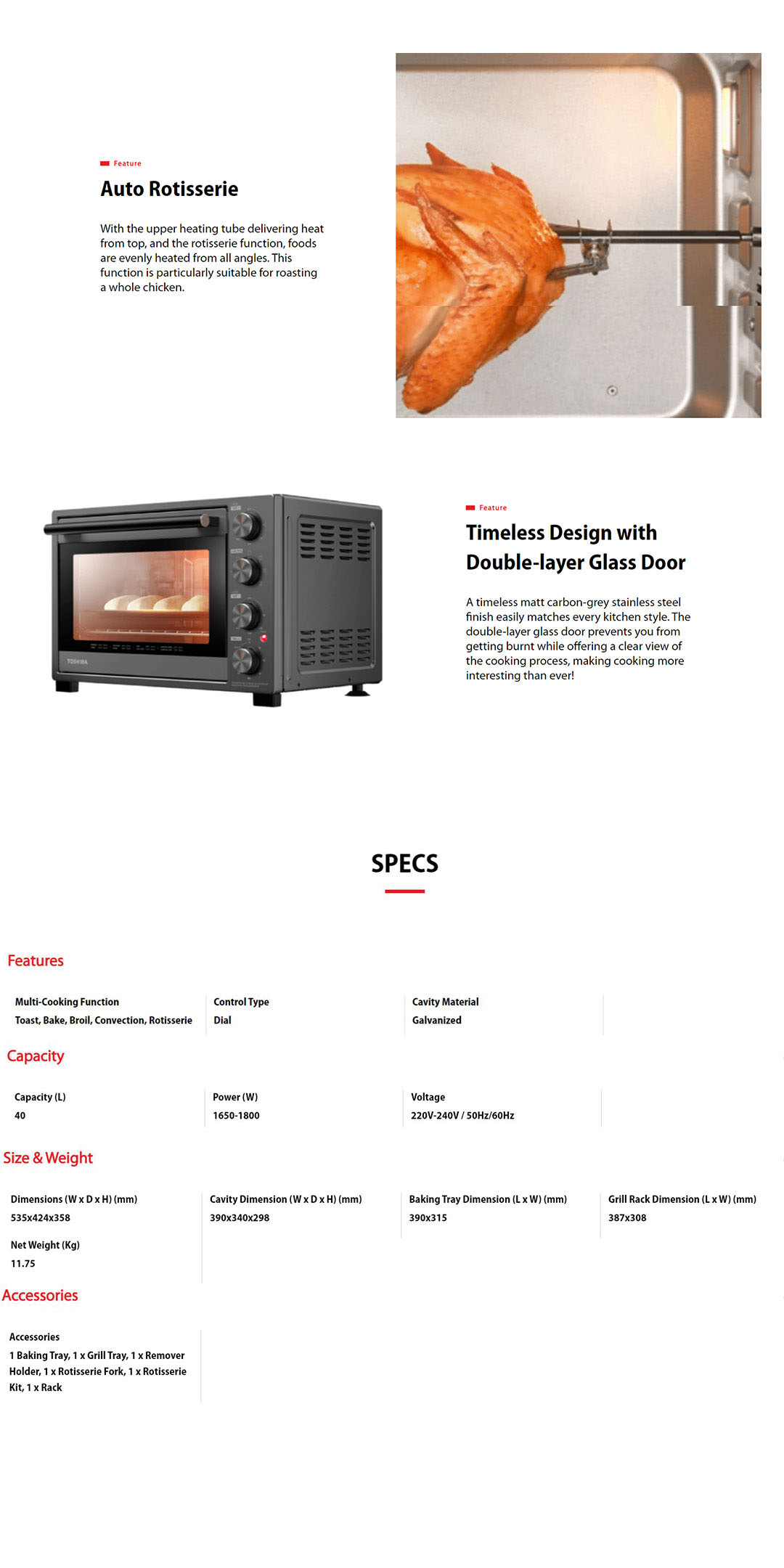 TOSHIBA 40L Toaster Oven TL-MC40EZF(GR) | Independent Temperature Control Knobs | Parallel Heating Elements Work with Convection Fan | Auto Rotisserie | Timeless Design with Double-layer Glass Door | Toaster Oven with 1 Year Warranty