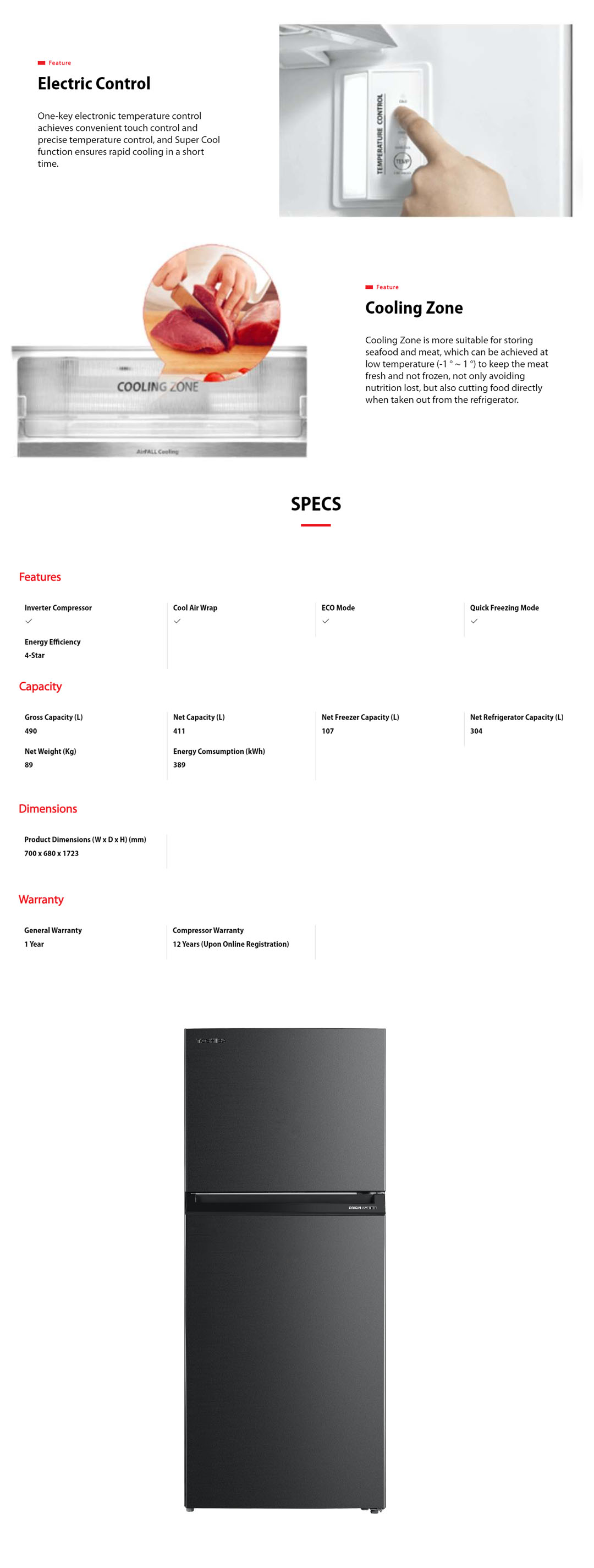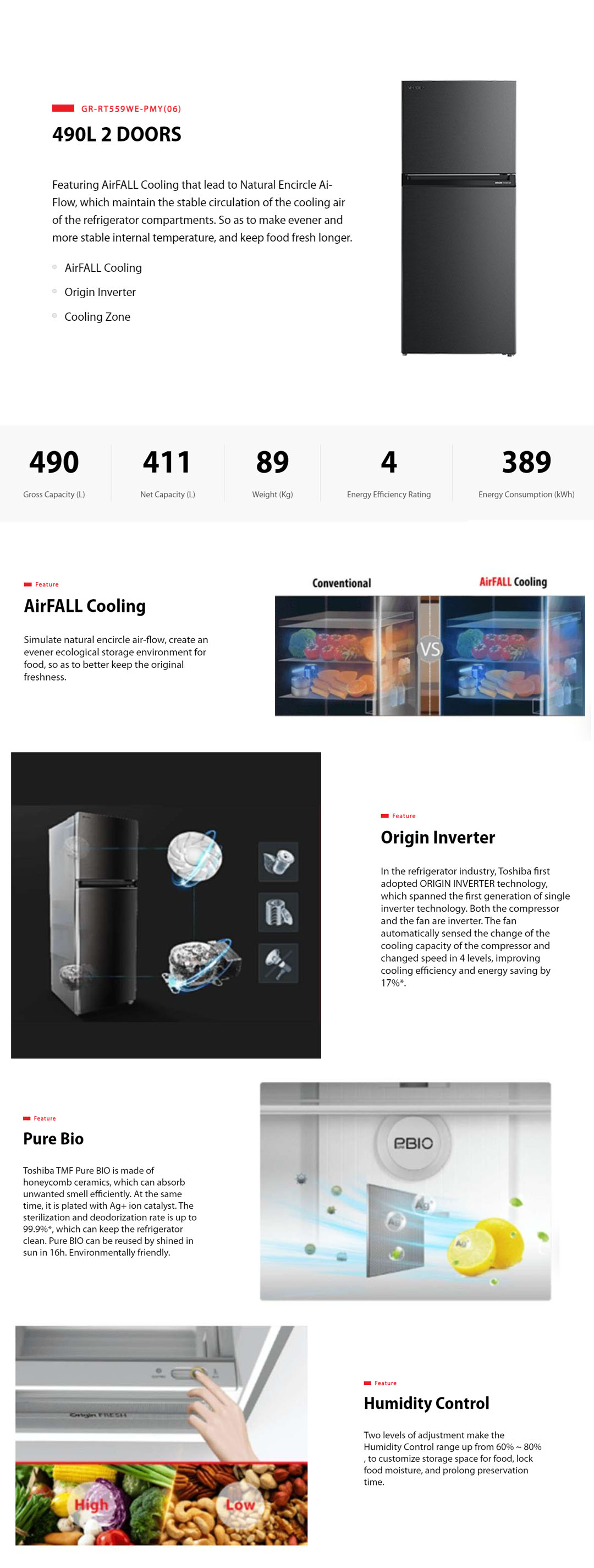 Toshiba 490L 2 Doors Top Mount AirFall Origin Inverter Refrigerator GR-RT559WE-PMY(06) | Pure Bio | Humidity Control | Electric Control | Cooling Zone | Origin Inverter | AirFALL Cooling | Refrigerator with 1 Year Warranty