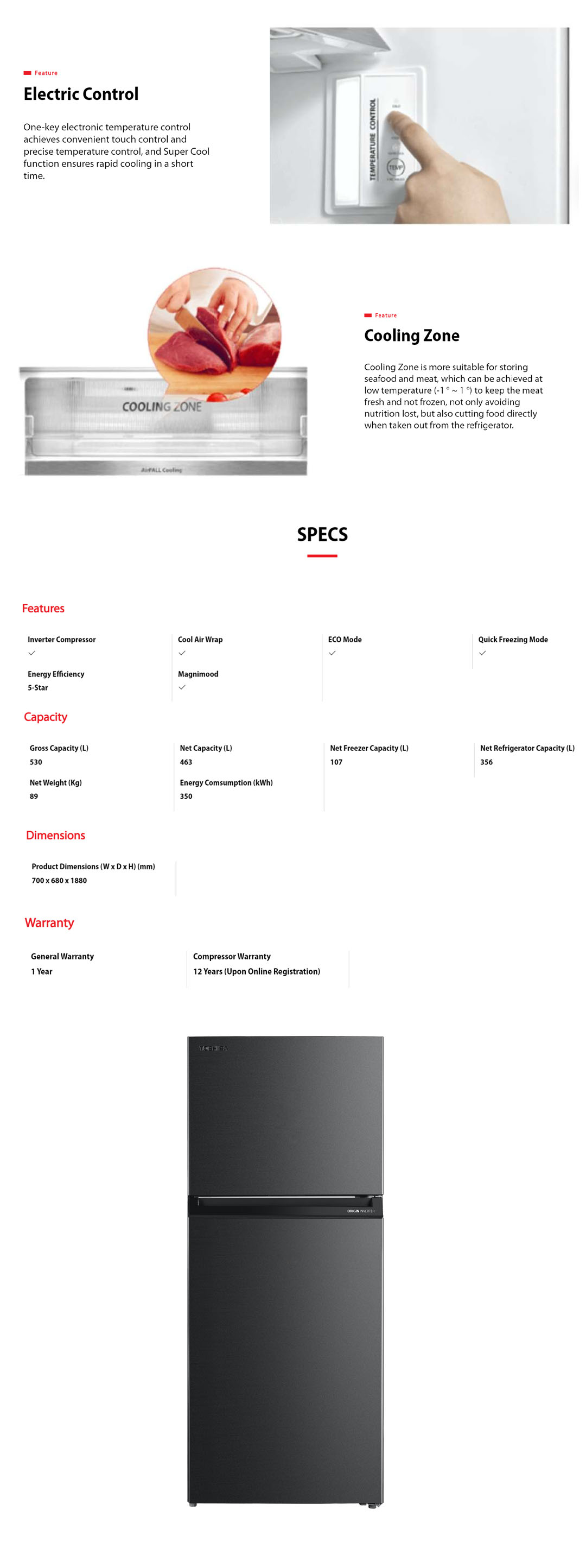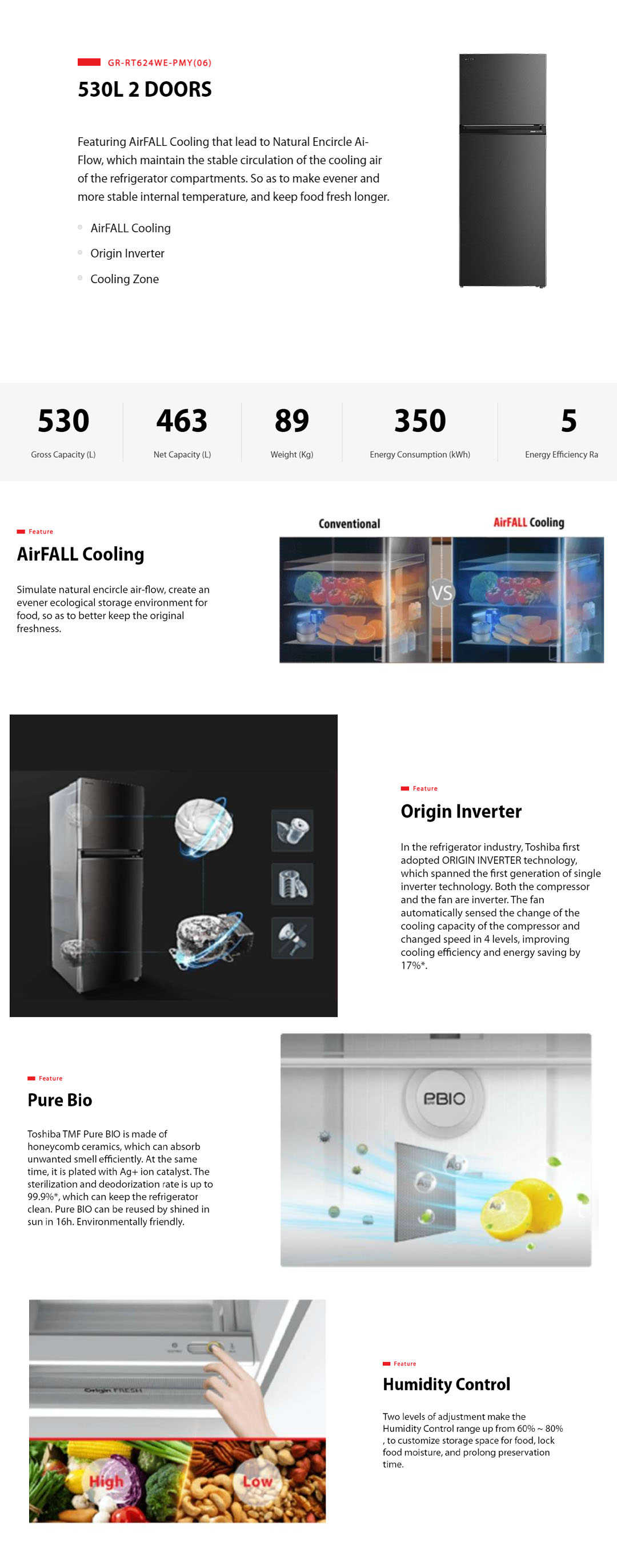 Toshiba 530L 2 Doors Top Mount AirFall Origin Inverter Refrigerator GR-RT624WE-PMY(06) | Pure Bio | Humidity Control | Electric Control | Cooling Zone | Origin Inverter | AirFALL Cooling | Refrigerator with 1 Year Warranty