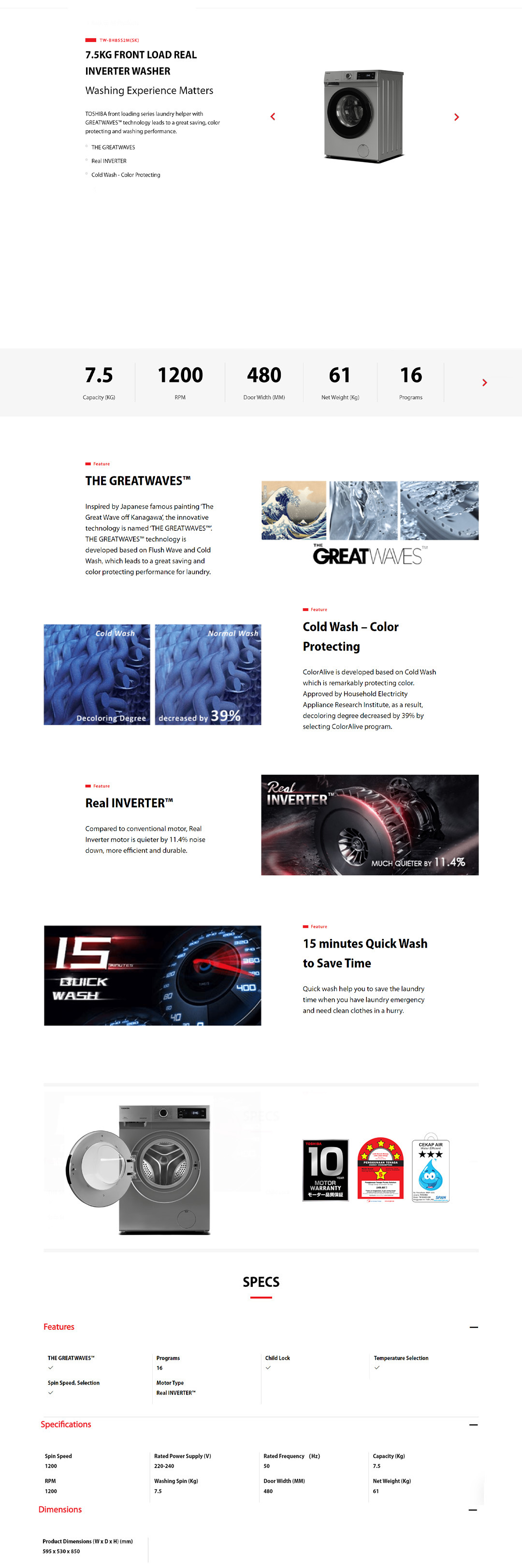 TOSHIBA 7.5KG Front Load Real Inverter Washing Machine with THE GREATWAVES TW-BH85S2M(SK) | 16 Program | Child Lock | Temperature Selection | Spin Speed, Selection | Washing Machine with 2 Year Warranty