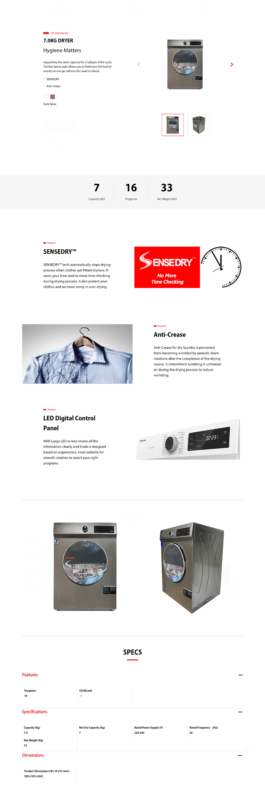 TOSHIBA 7KG Vented SENSEDRY Tumble Dryer TD-H80SEM(SK) | LED Display | Anti-Crease | Quick Dry 20 | LED Display | SENSEDRY | Air Vented Drying | Child Lock| Dryer with 2 Year Warranty