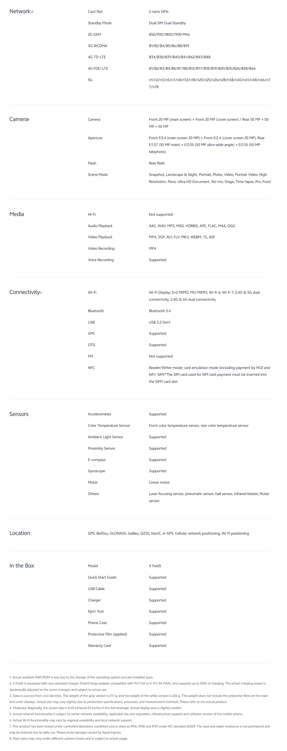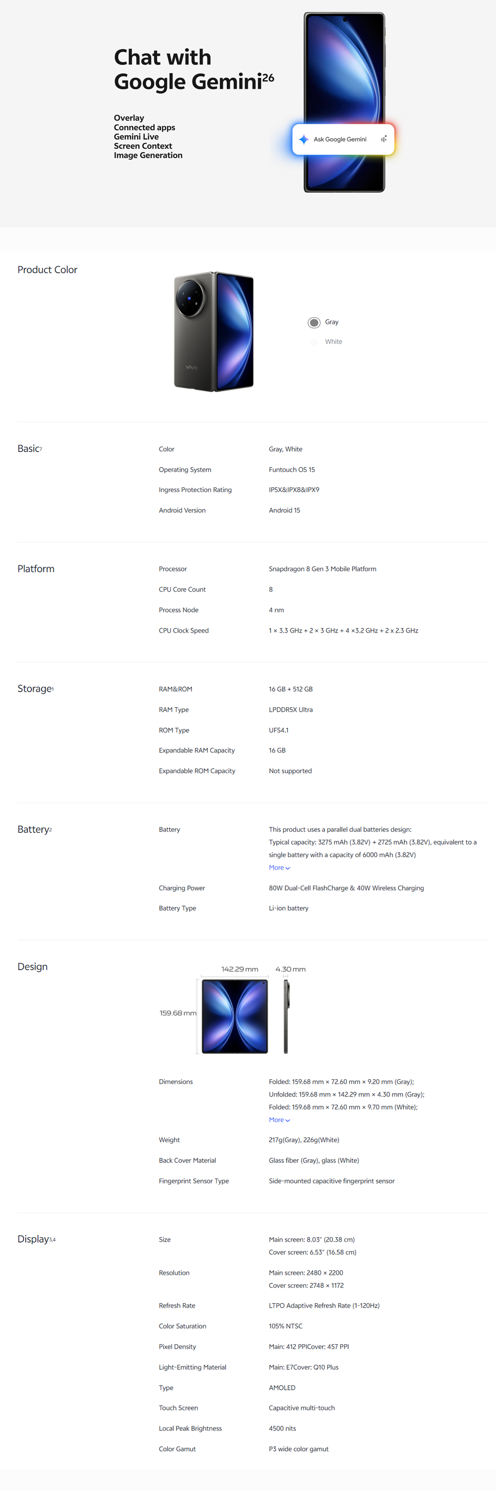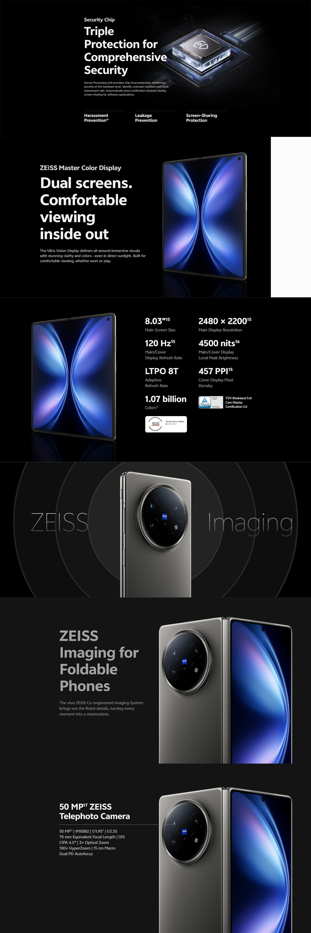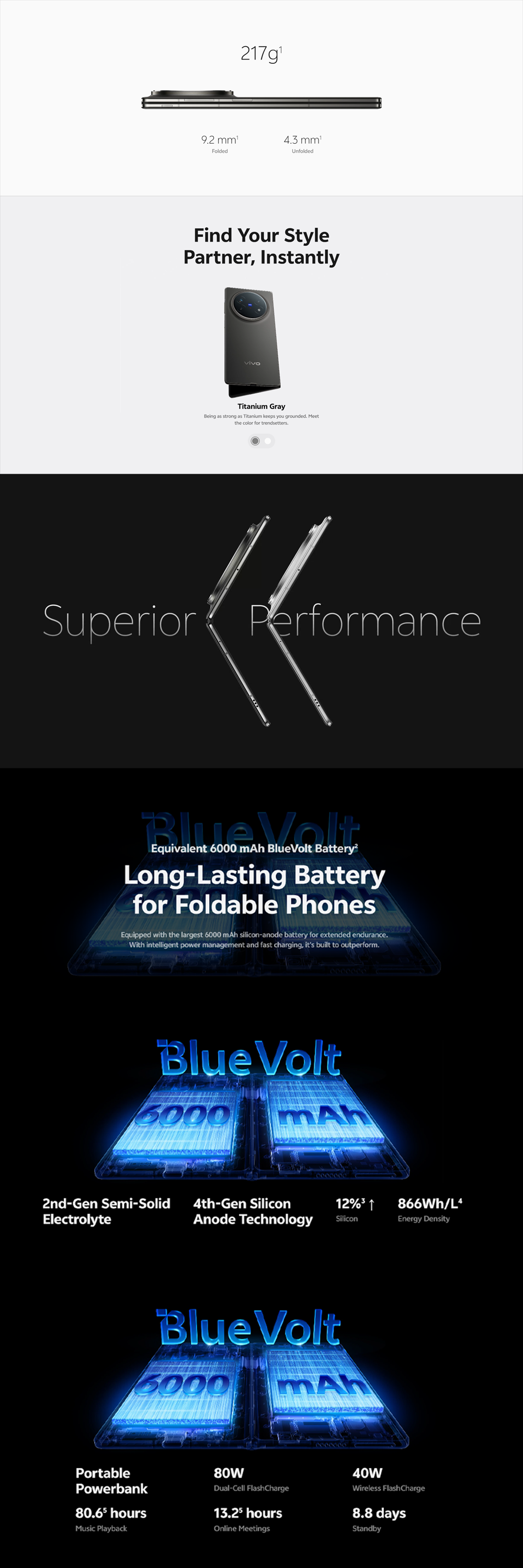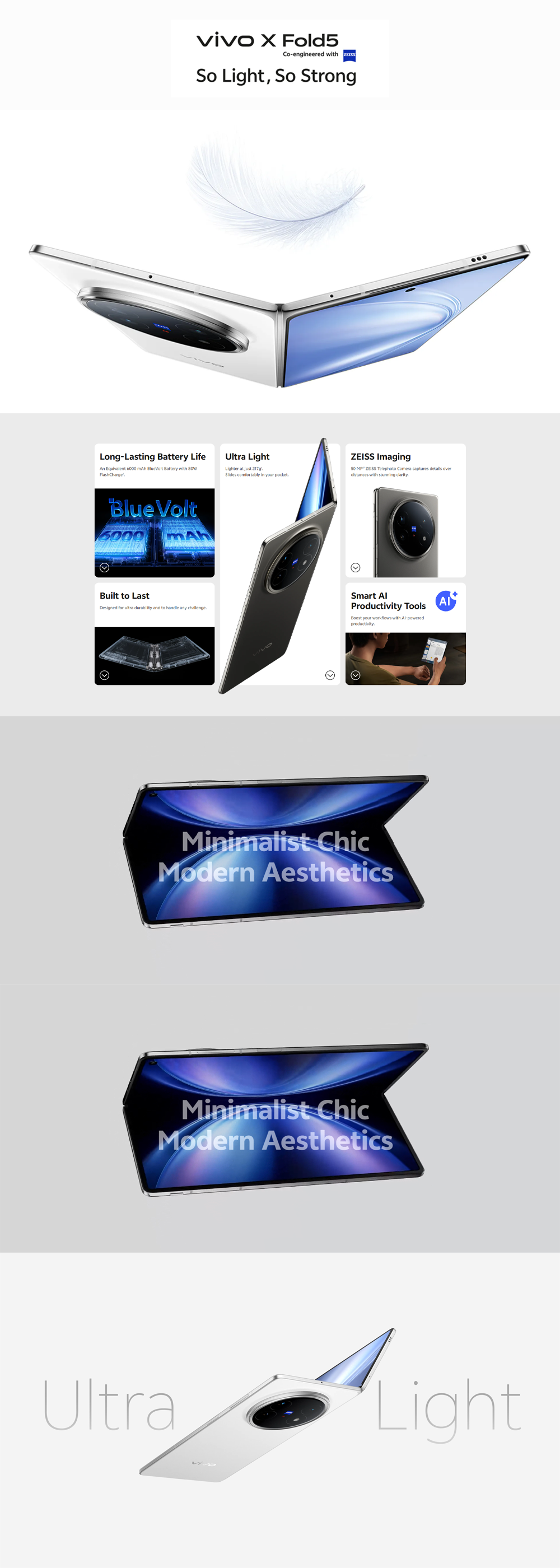vivo X Fold5 5G | 6000mAh BlueVolt Battery | 80W Dual-Cell FlashCharge | 8.03" 2k ZEISS Master Colour Display | AI Multitasking | 50MP ZEISS Telephoto Camera