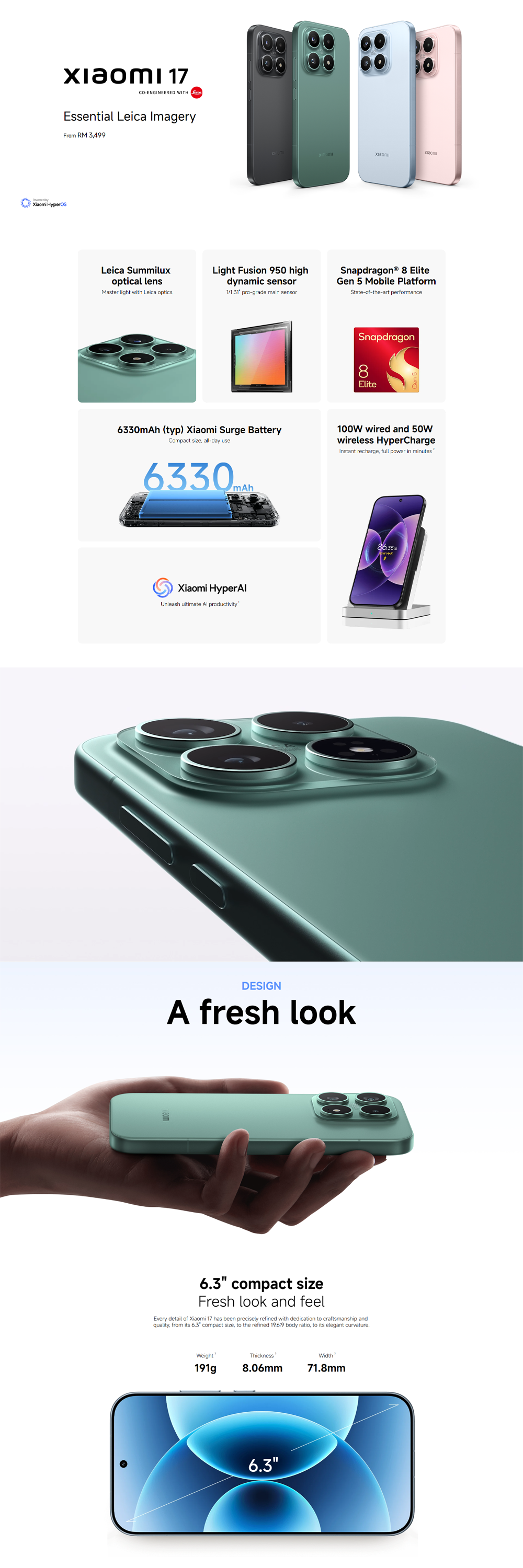 Xiaomi 17 12GB+512GB/12GB+256GB | 6.3", LTPO AMOLED | 50MP Rear Camera | Qualcomm SM8850-AC Snapdragon 8 Elite Gen 5 (3 nm) | Li-Po 6330mAh
