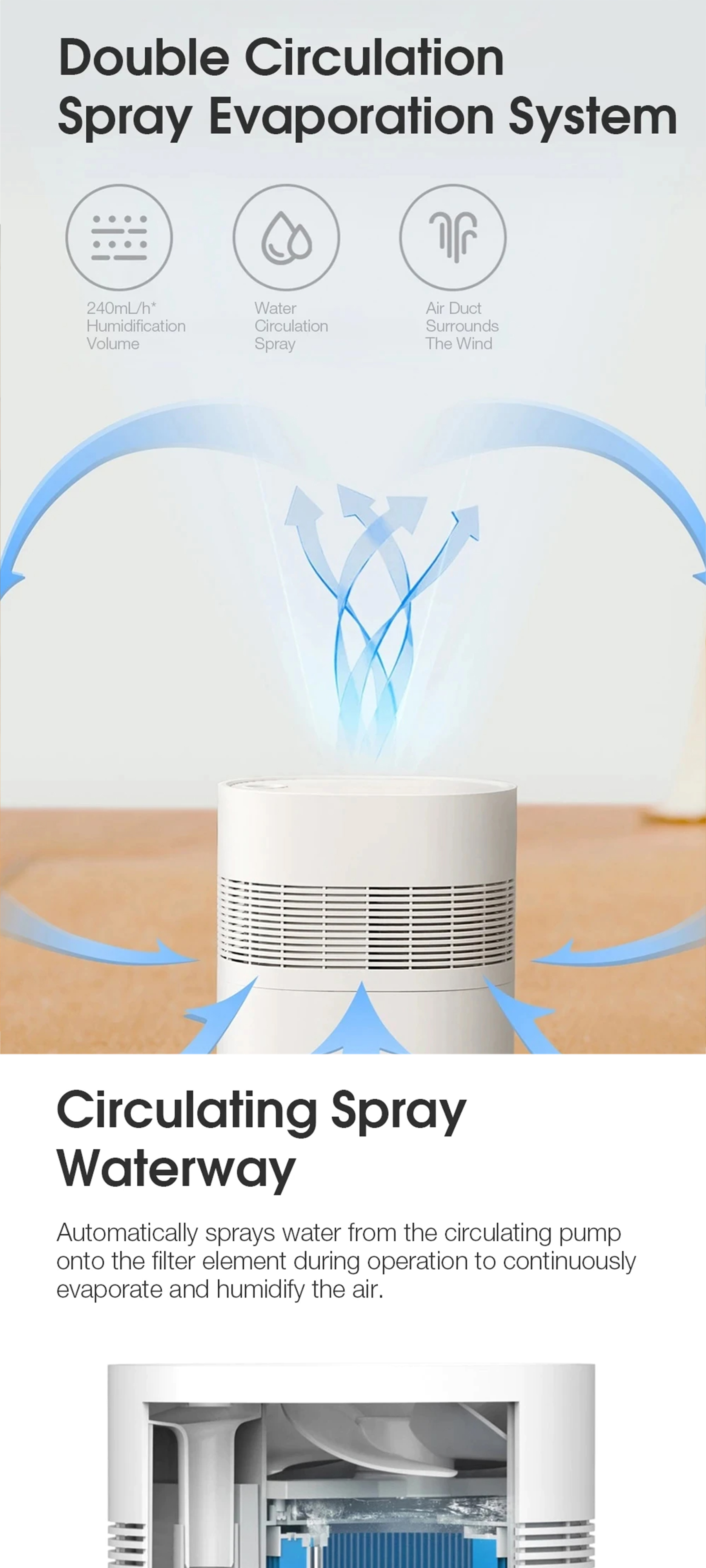● Double Circulation Spray Evaporation System: 240ml/h, redesign the waterway and air duct system, the air is efficient and