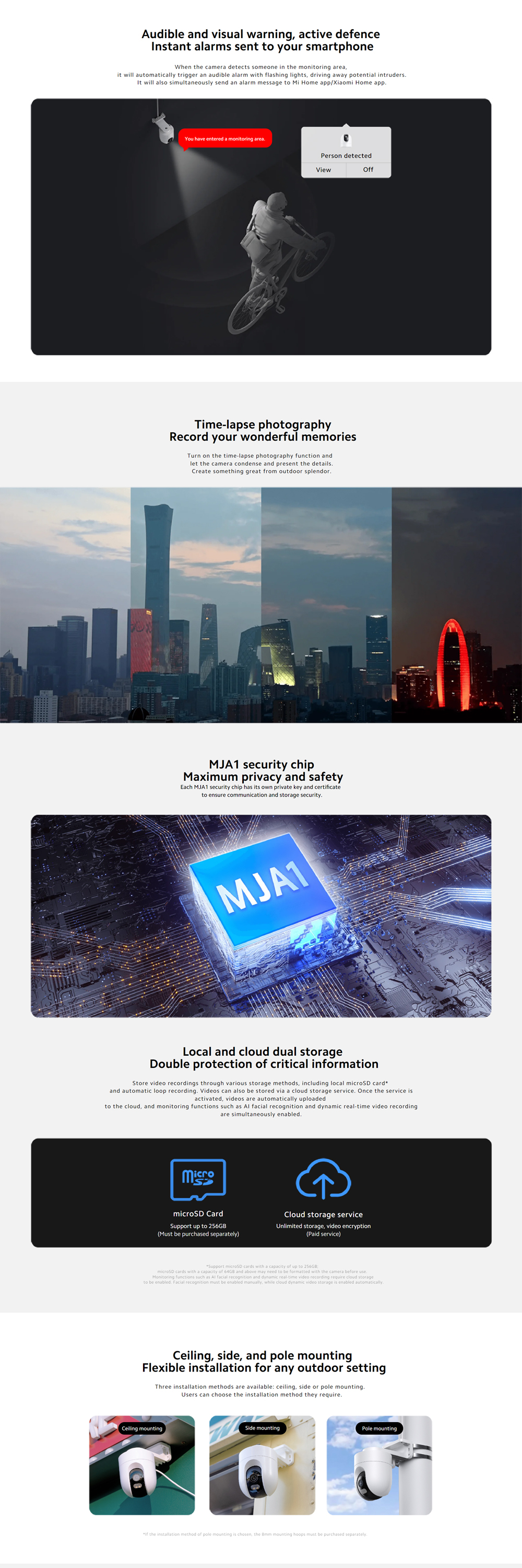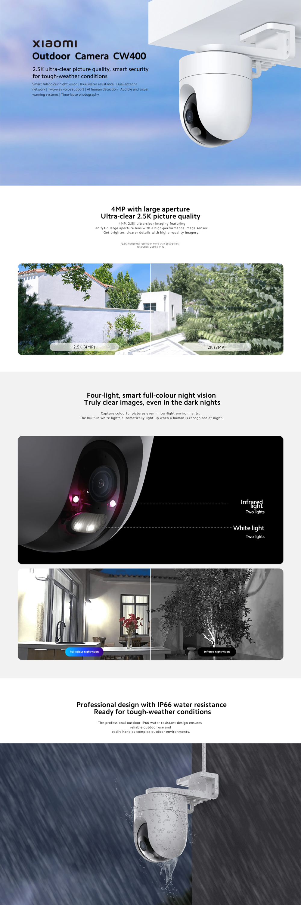 Xiaomi 2500P Outdoor Camera | Smart full-colour night vision | IP66 water resistance | Dual-antenna network | Two-way voice support | AI human detection | Audible and visual warning systems | Time-lapse photography
