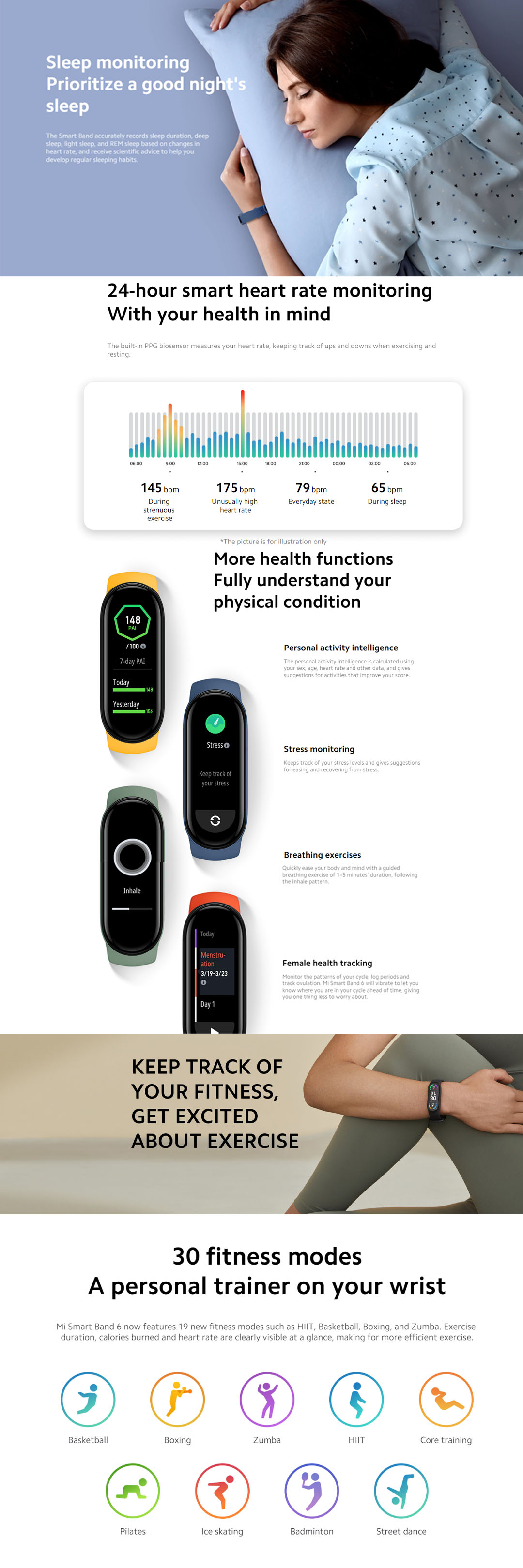 · AMOLED Display · 30 Fitness Modes · Heart Rate Monitoring