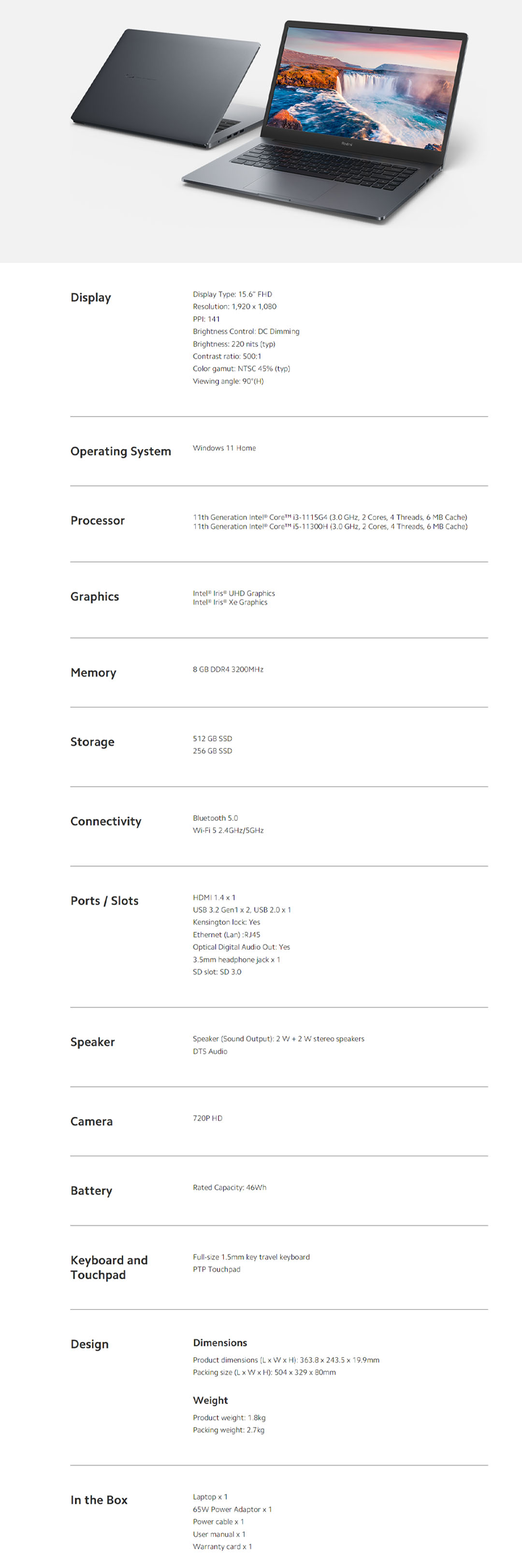 Xiaomi RedmiBook 15 Laptop (Intel Core i3-1115G4/ Intel Core i5-11300H/ 8GB+256GB SSD/ 8GB+512GB SSD/15.6-inch FHD/ W11) | Multiple Ports with Security Locks | Thin and Light-weight | Long Battery Life | Laptop with 2 Years Warranty