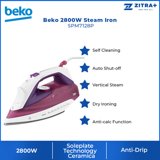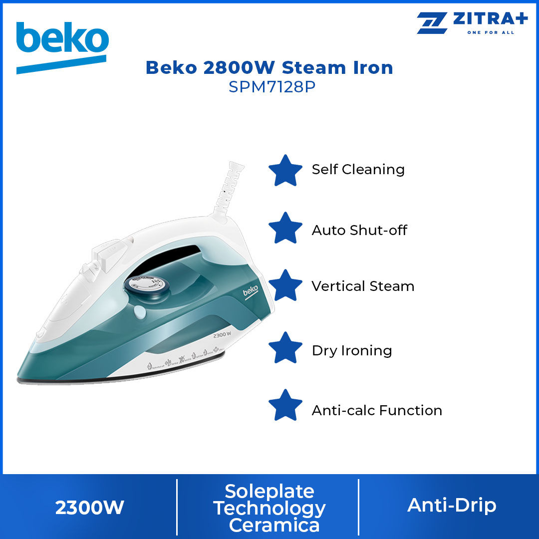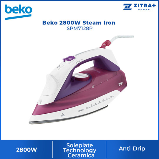 Beko 2800W Steam Iron SPM7128P | Continuous Steam | Ceramica Soleplate | Anti-drip | Auto Shut-off | Anti-Calc Function | Iron with 2 Years Warranty
