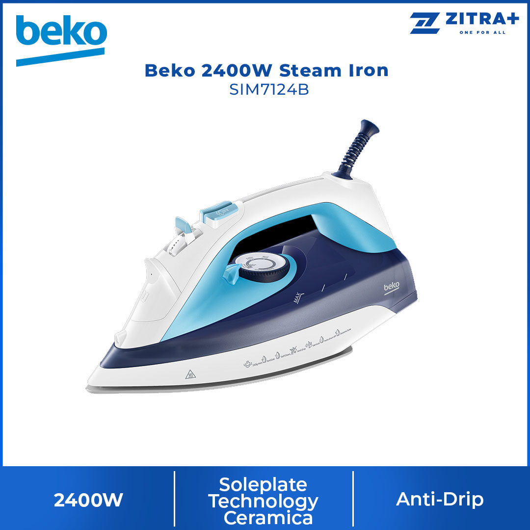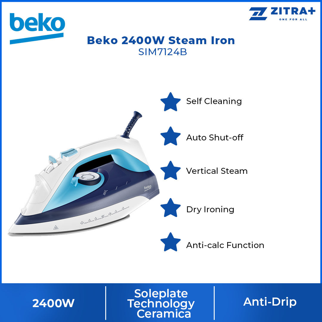 Beko 2400W Steam Iron SIM7124B | Continuous Steam | Ceramica Soleplate | Anti-drip | Auto Shut-off | Anti-calc Function | Iron with 2 Years Warranty
