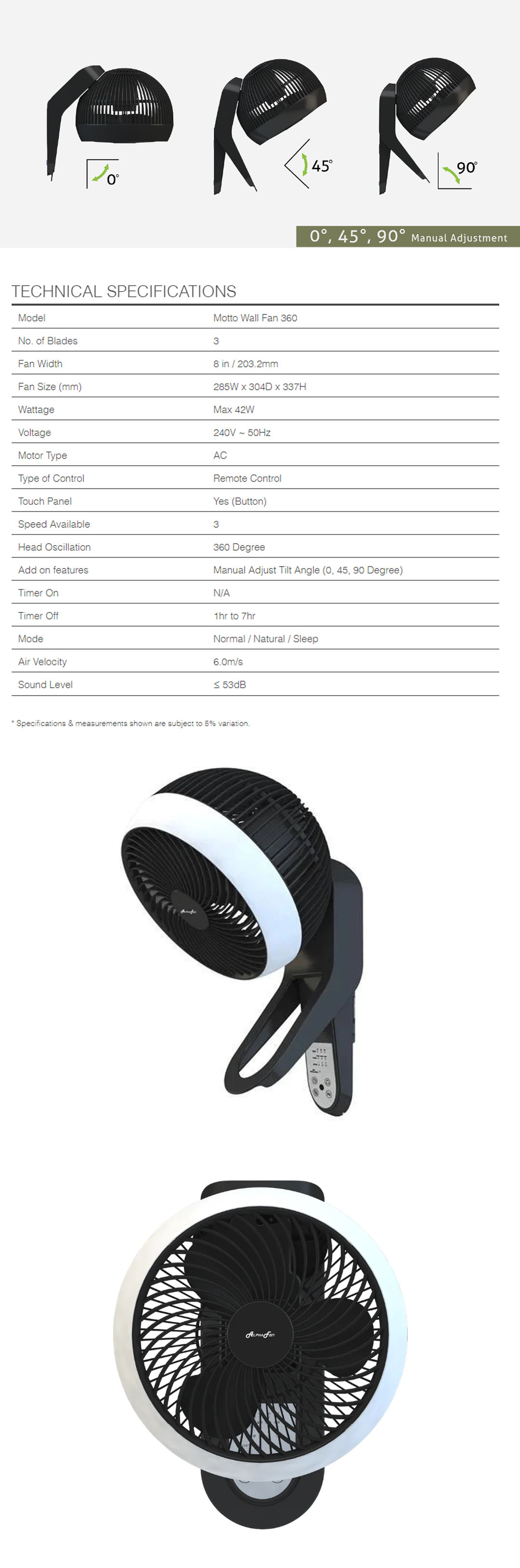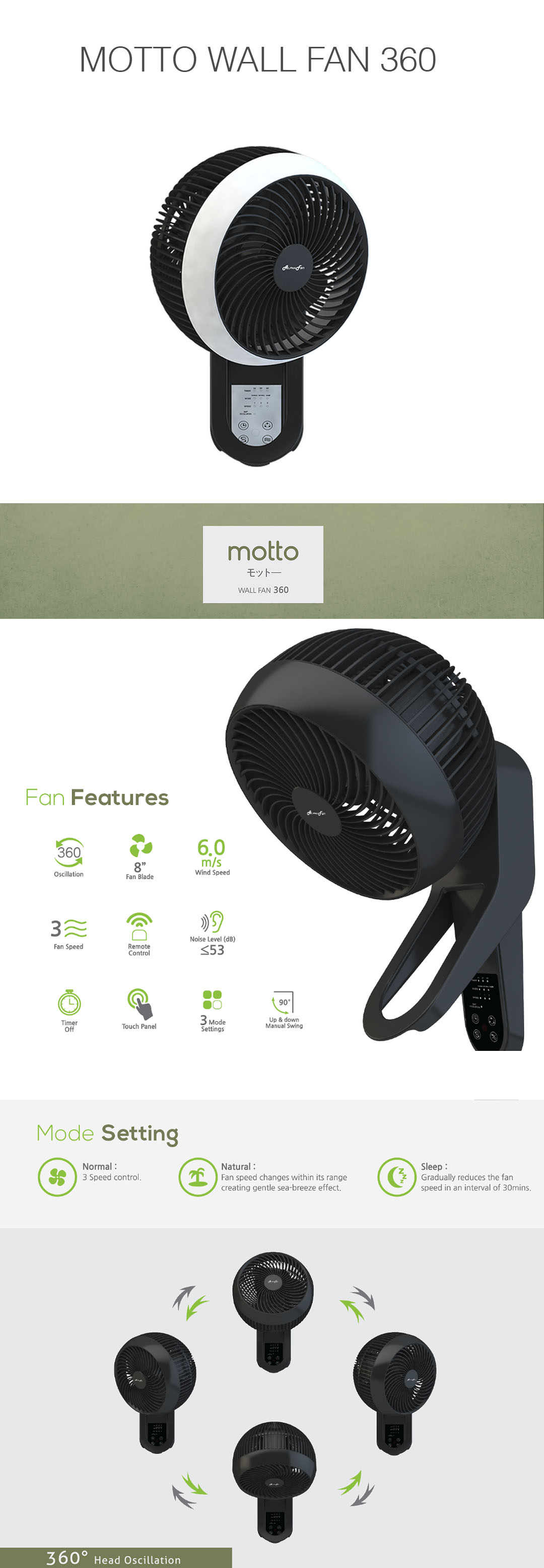 ALPHA 8" Wall Fan MOTTO WALL FAN 360 | Up & Down Manual Swing | 3 Fan Speed | 3 Blades | 360 Oscillation | Remote Comtrol | Touch Panel | 3 Mode Settings | Wall Fan with 1 Year Warranty