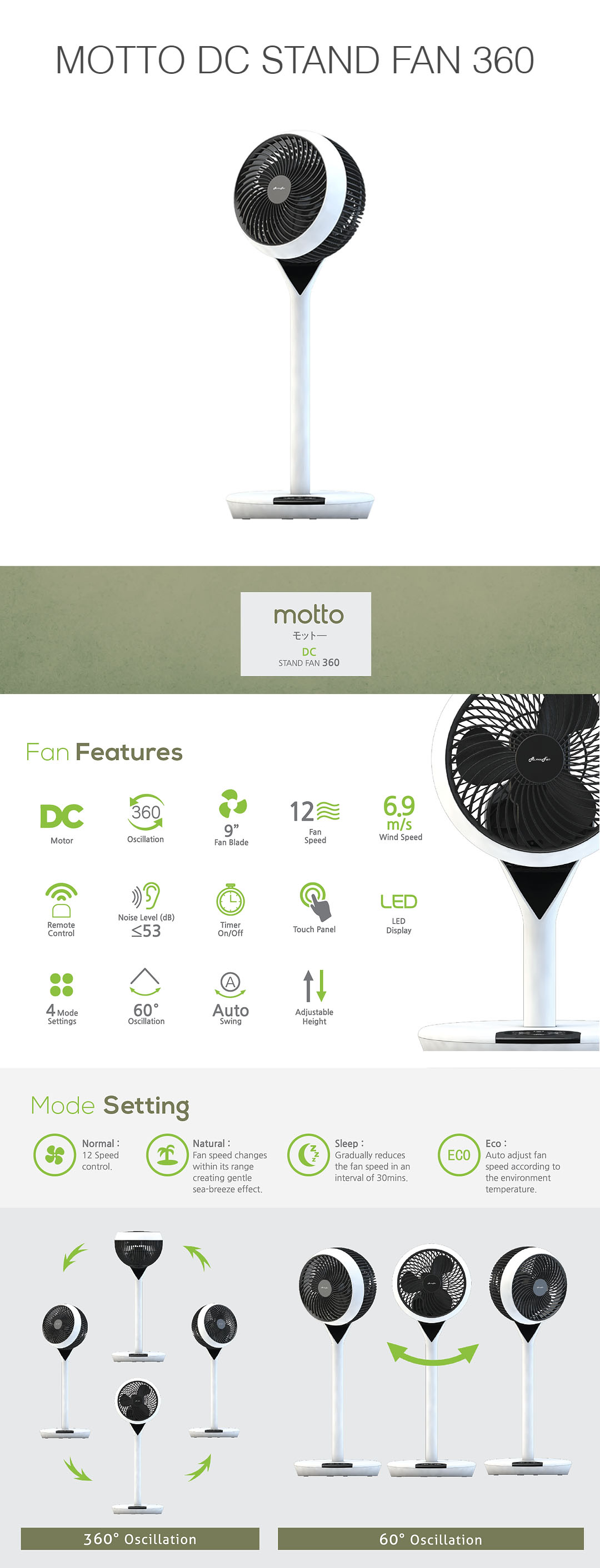 ALPHA 9" Stand Fan MOTTO DC STAND FAN 360 | Auto Swing | LED Display | 12 Fan Speed | 3 Blades | 360 Oscillation | Remote Control | Touch Panel | 4 Mode Settings | Stand Fan with 1 Year Warranty