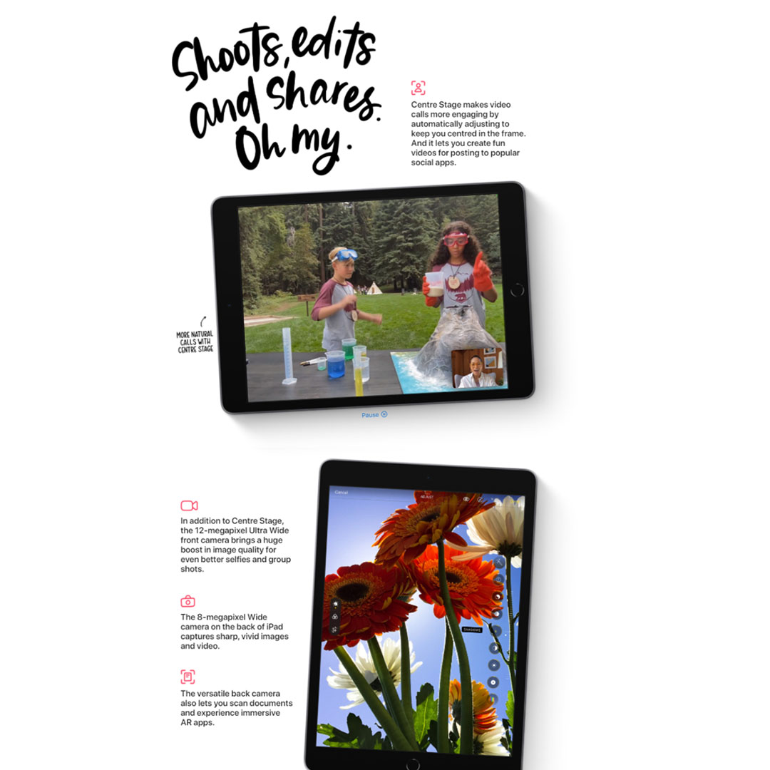 · 8MP Wide back camera, 12MP Ultra Wide front camera with Centre Stage