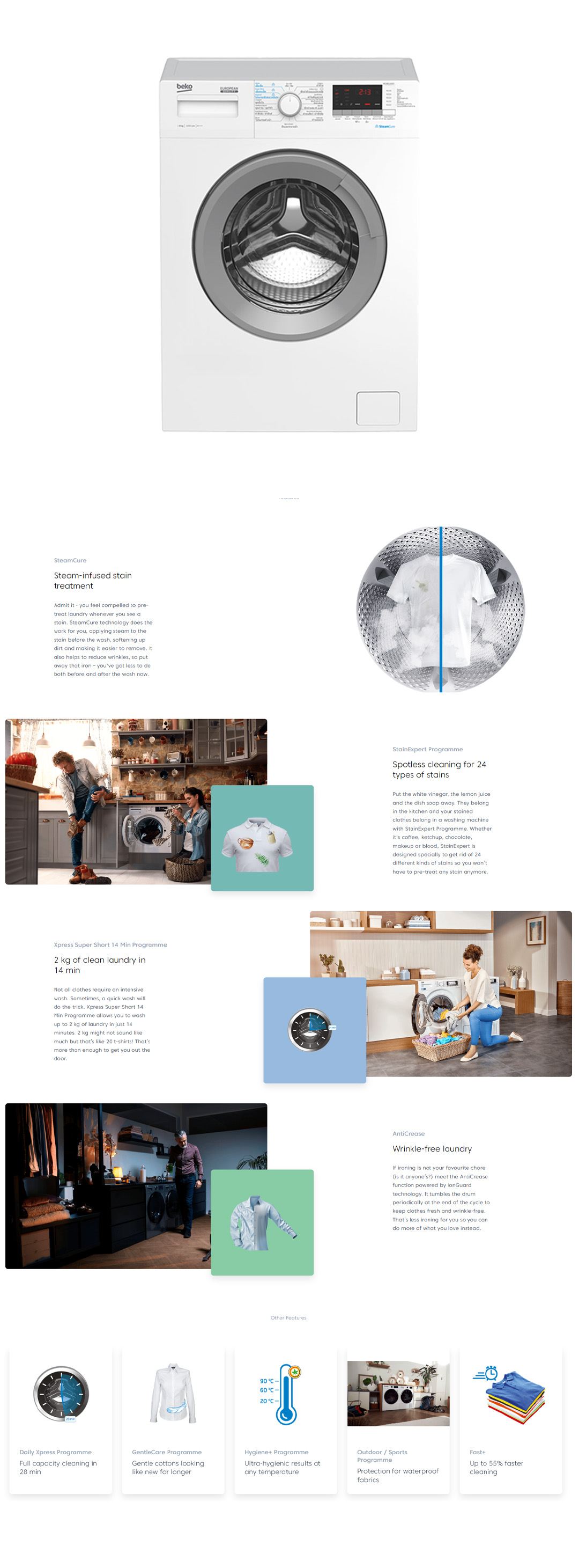 Beko 8KG Front Load ProSmart Inverter Washing Machine WCV8612XS0ST | SteamCure | AntiCrease | Prewash | Extra Rinse | Fast+ | Washing Machine with 1 Year Warranty