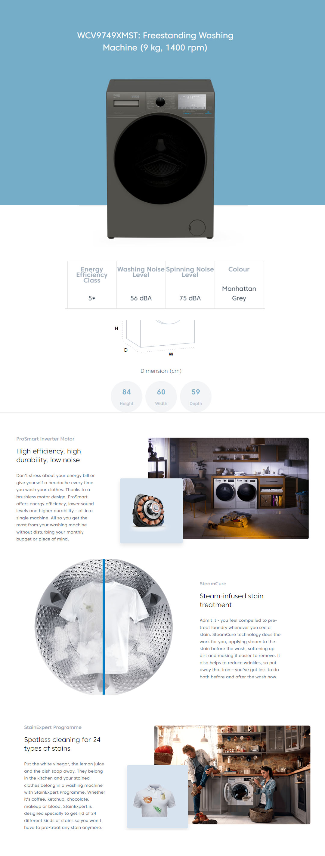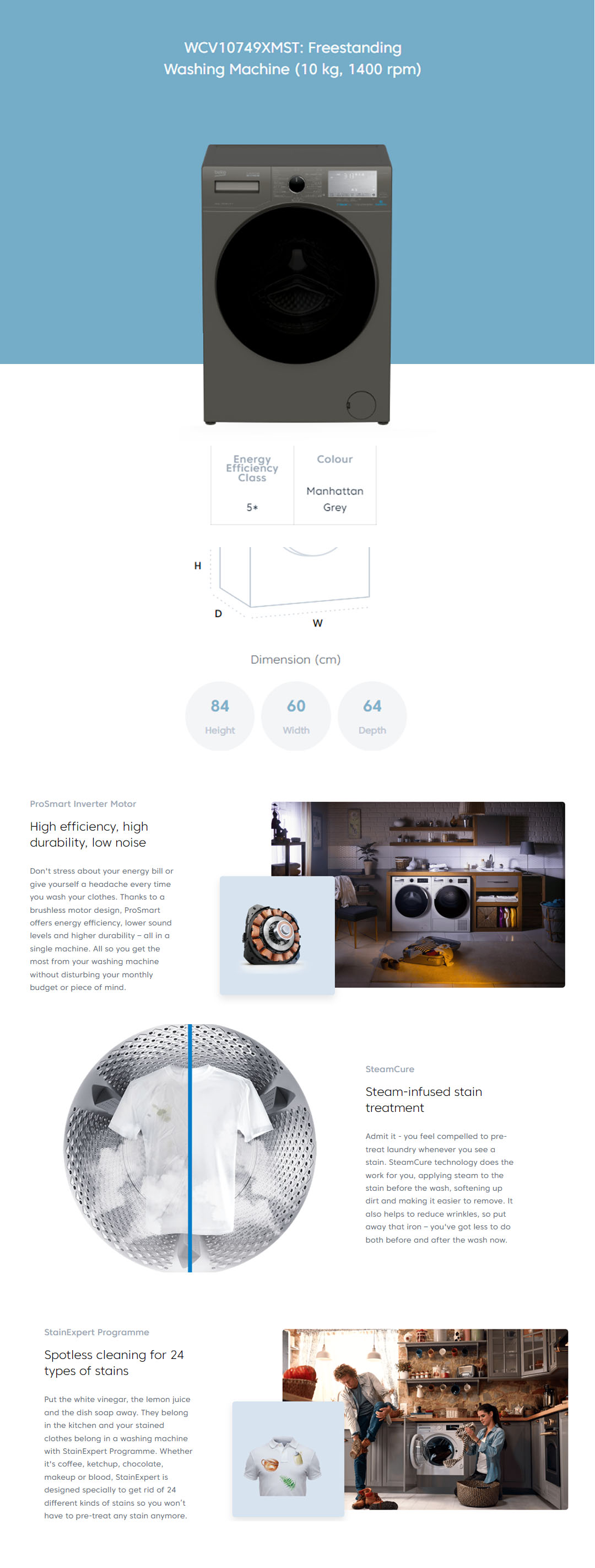 Beko Front Load ProSmart Inverter Washing Machine WCV10749XMST/WCV9749XMST | SteamCure | Fast+ | Child Lock | Overflow Safety | Bluetooth | Washing Machine with 2 Year Warranty