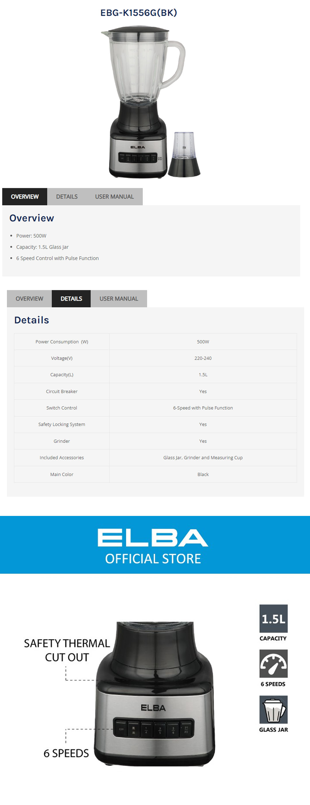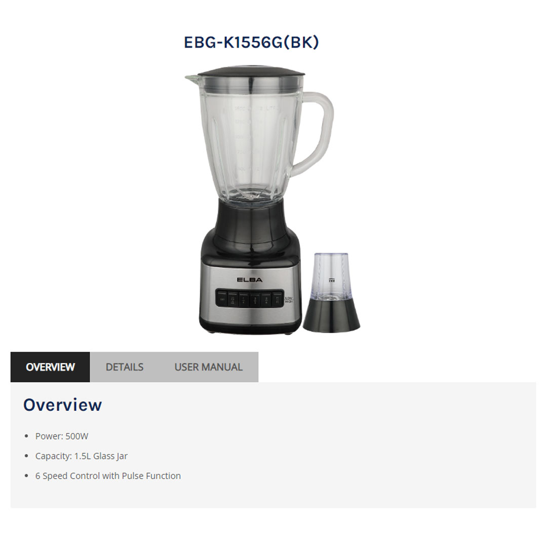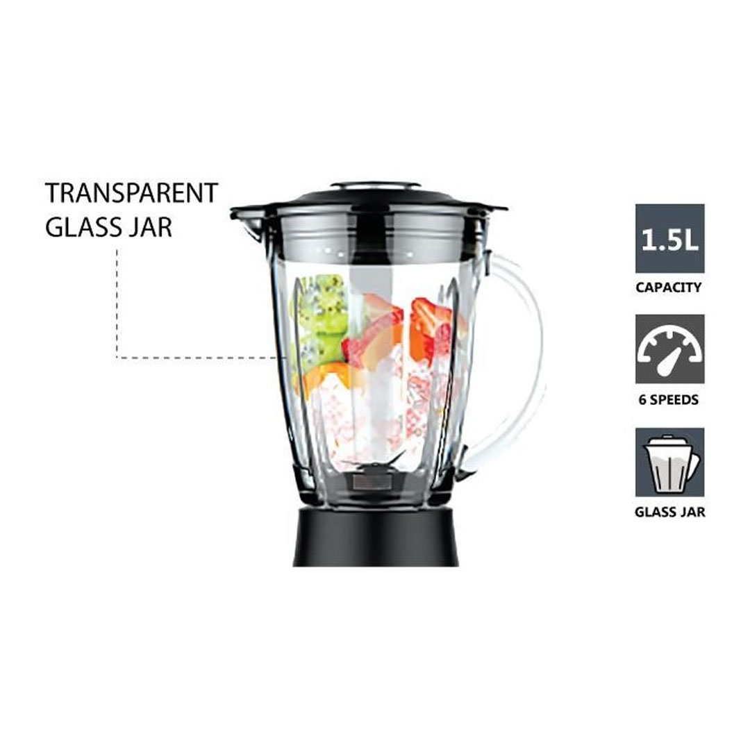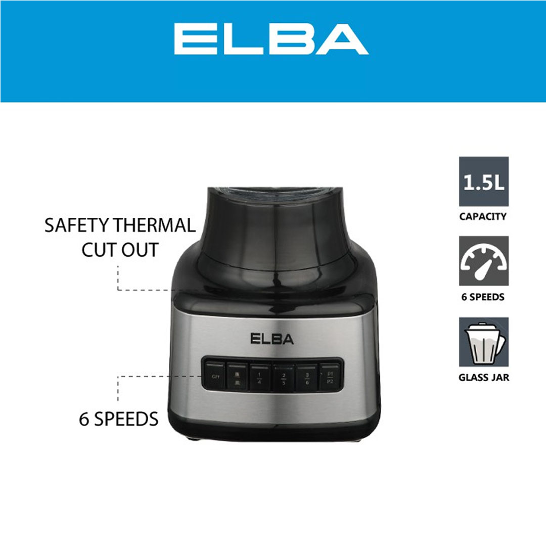 ELBA 1.5L Blender EBG-K1556G(BK) | 6 Speed Control with Pulse Function | Included Glass Jar, Grinder and Measuring Cup | Safety Locking System | Blender with 1 Year Warranty