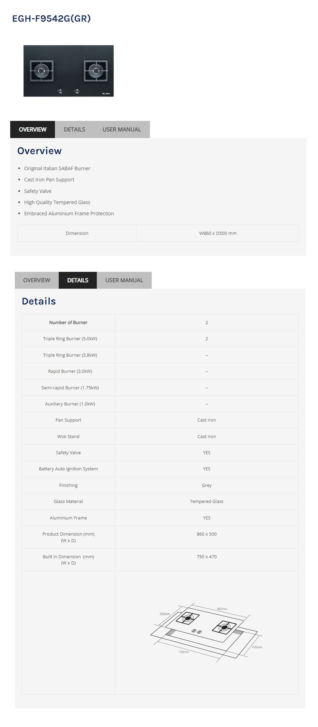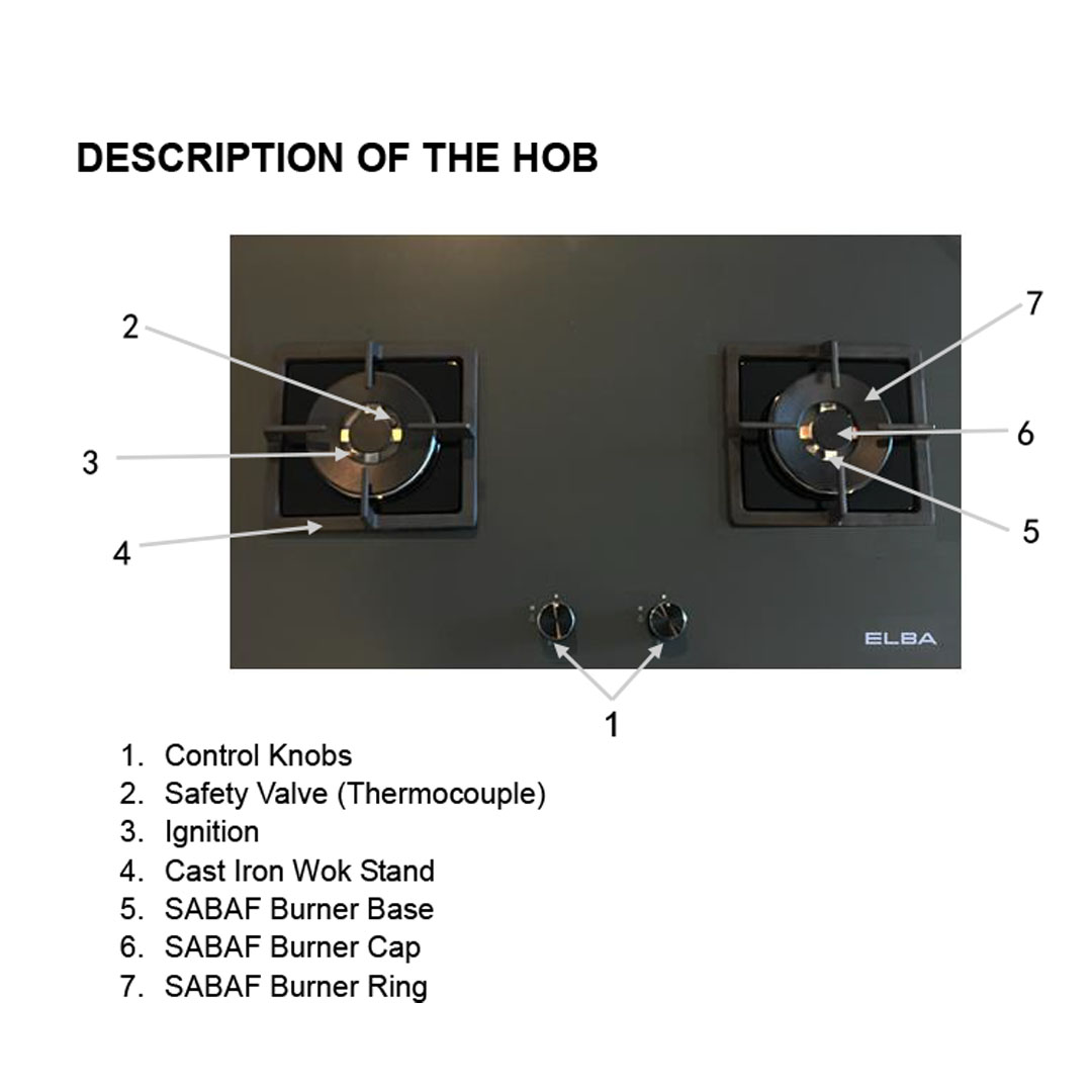 ELBA 2 Burners Built-In Glass Hob EGH-F9542G(GR) | Original Italian SABAF Burner | Cast Iron Pan Support | Embraced Aluminium Frame Protection | Hob with 1 Year Warranty