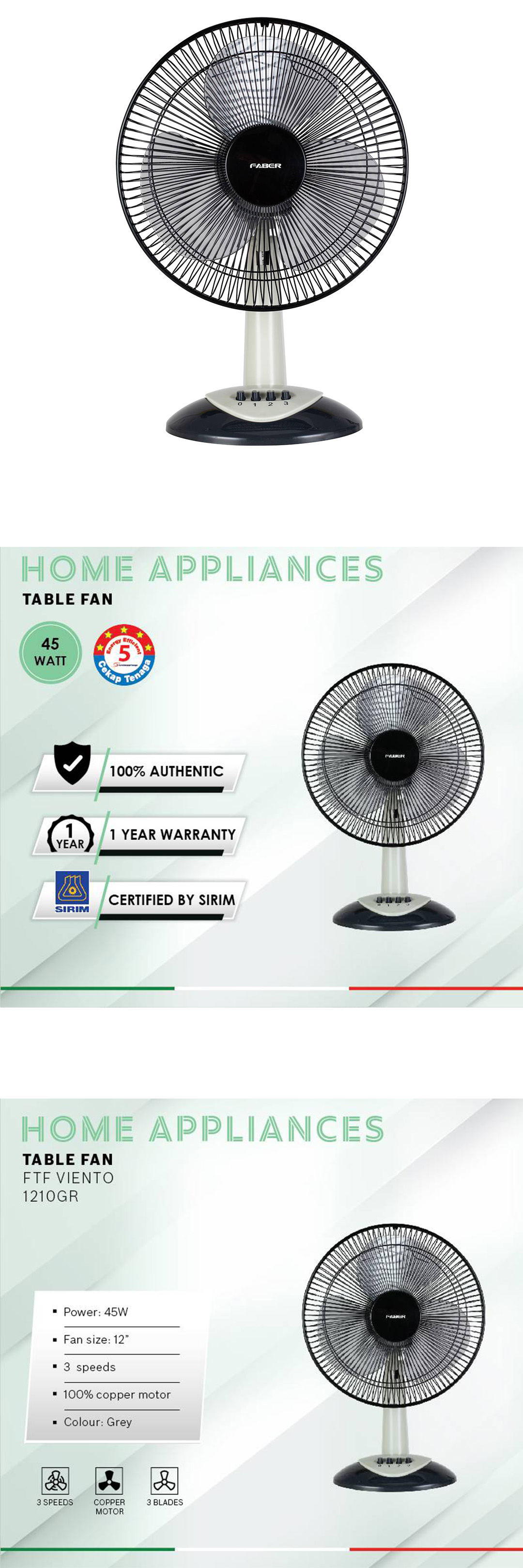 FABER 12" Table Fan FTF VIENTO 1210GR | 3 Blades | 3 Speed Selection | 1250rpm Fan Speed | 52.5dB Noise Level | Table Fan with 1 Year Warranty
