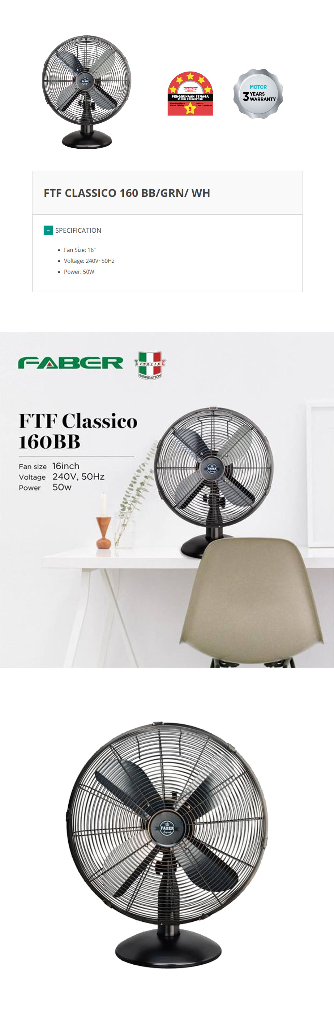● Fan Size 16" ● Voltage 240V-50Hz ● Power: 50W