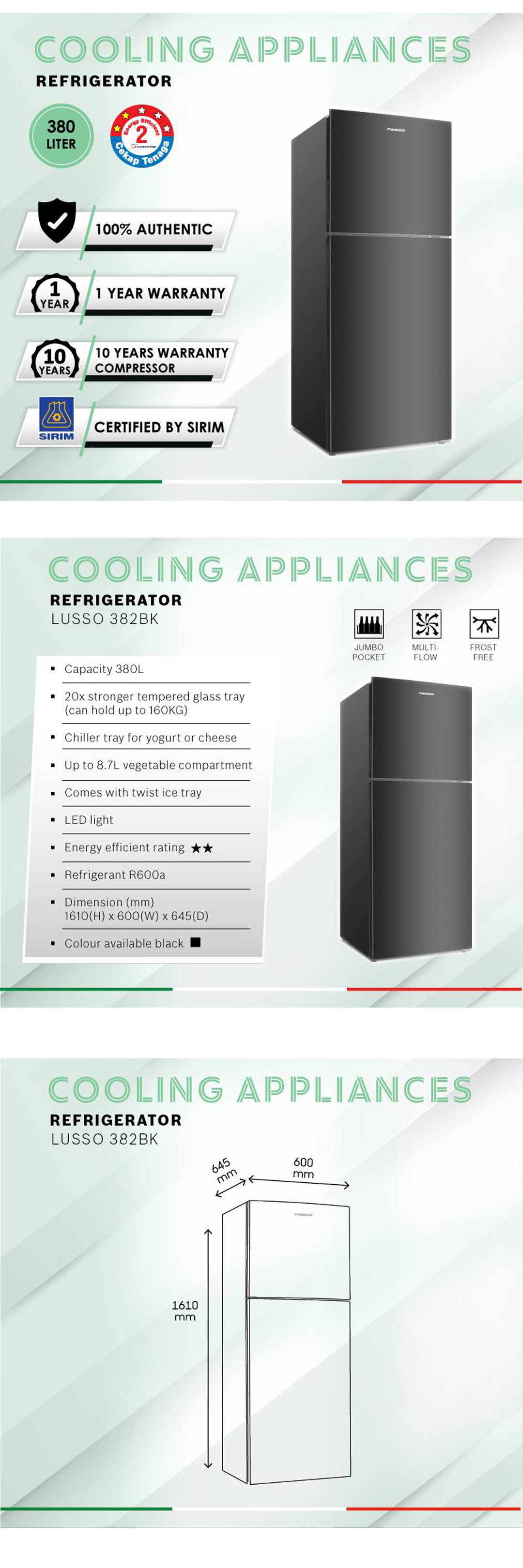 FABER 380L 2 Doors Refrigerator LUSSO 382BK | 20x Stronger Tempered Glass Tray | Refrigerant R600a | Fridge with 1 Year Warranty & Compressor with 10 Years Warranty