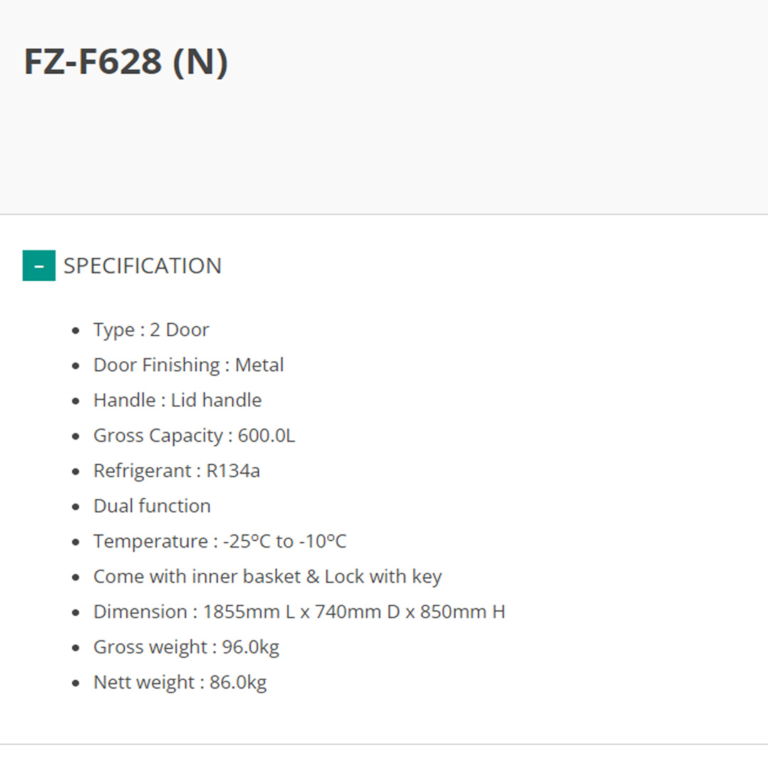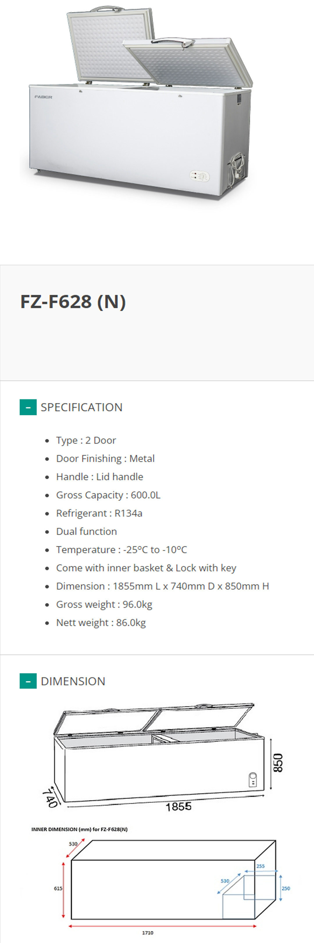 FABER 600L Chest Freezer FZ-F628 (N) | Dual Function | Come with Inner Basket & Lock with Key | Temperature : -25oC to -10oC | Chest Freezer with 1 Year General Warranty & 5 Years Compressor Warranty