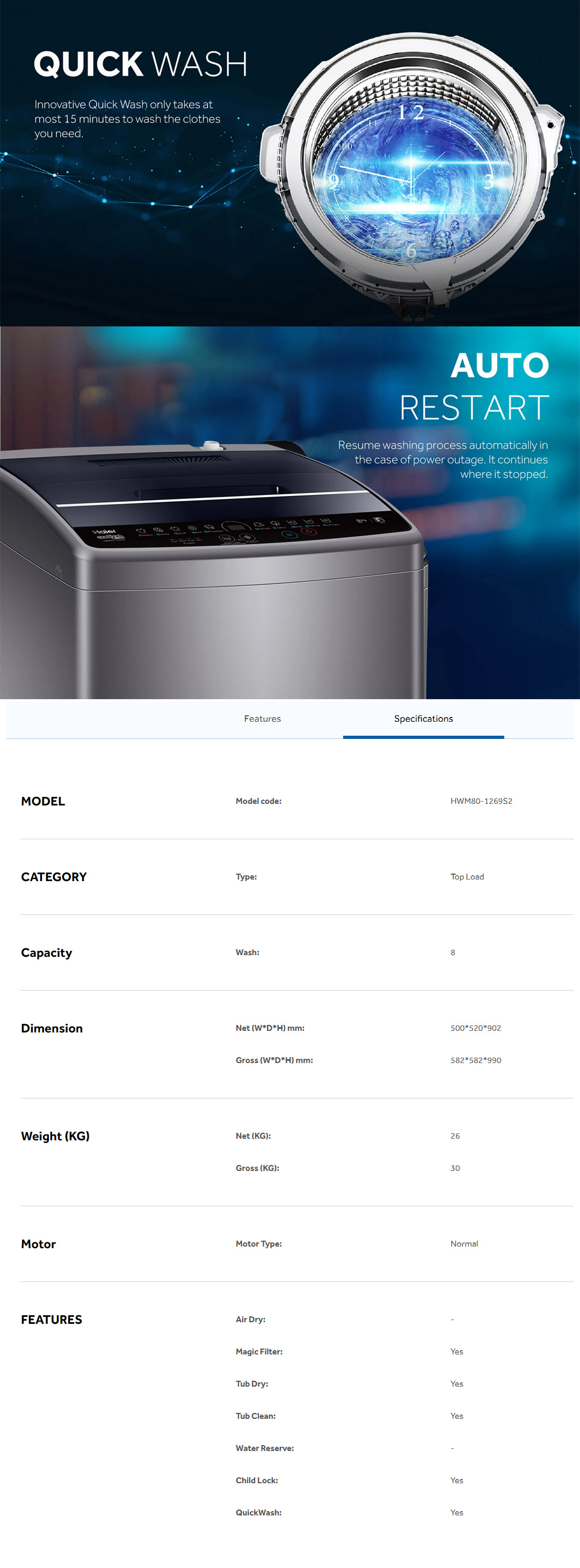 HAIER 8KG Top Load Washing Machine HWM80-1269S2 | Pillow Drum | Quick Wash | Stainless Steel Drum | Magic Filter | Washing Machine with 2 Year Warranty