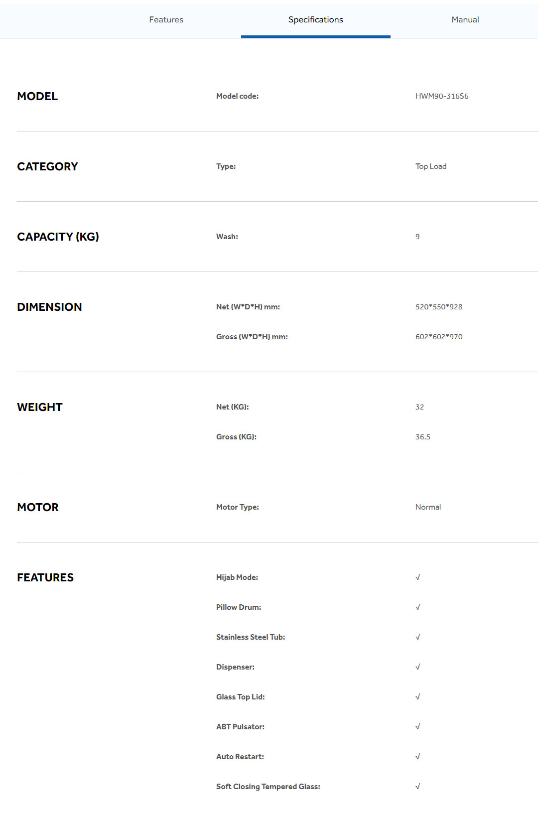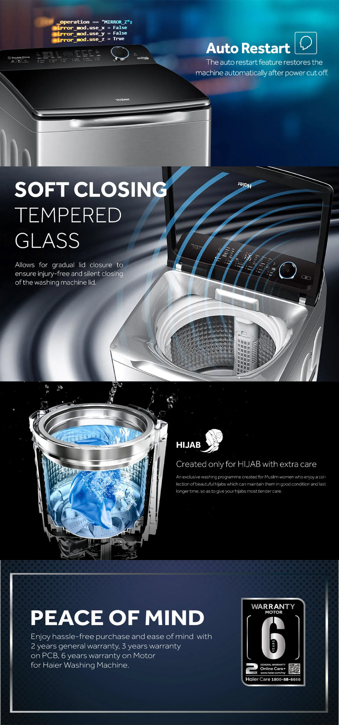 HAIER 9KG Top Load Washing Machines HWM90-316S6 | Pillow Drum | Hijab Mode | Auto Restart | Anti-Bacterial Pulsator | Washing Machine with 2 Years Warranty