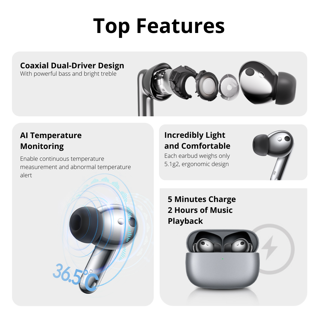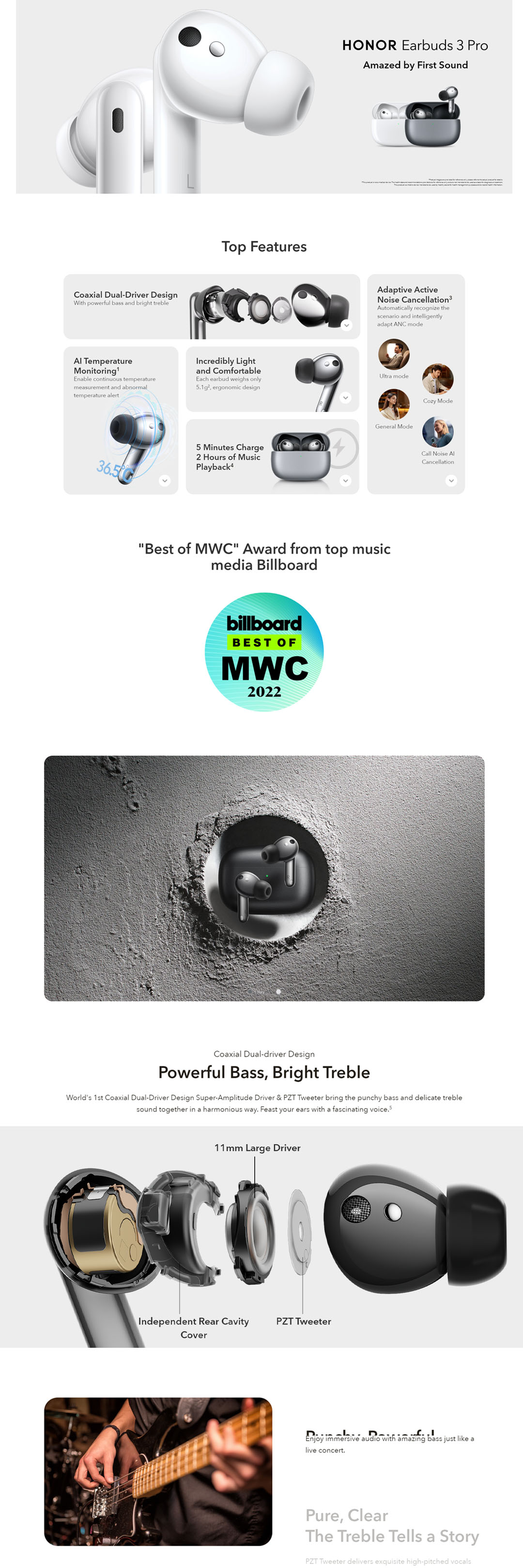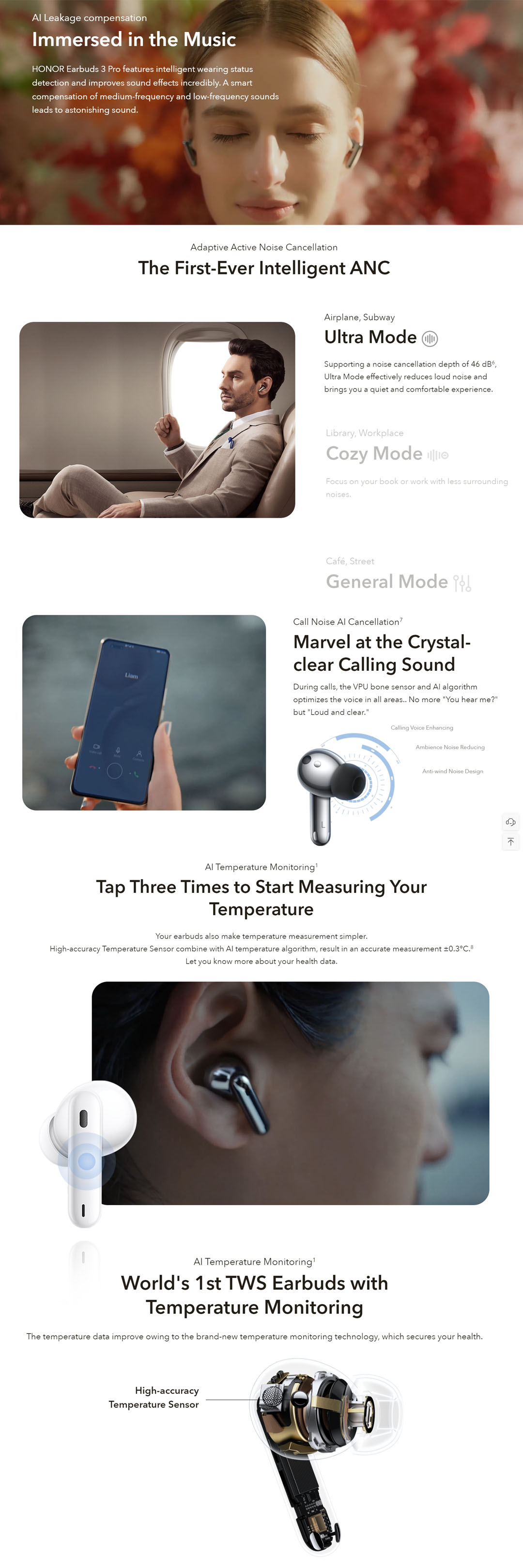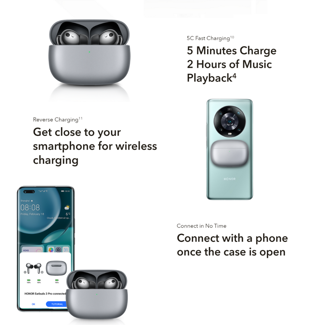 HONOR Earbuds 3 Pro | Coaxial Dual-driver Design | Adaptive Active Noise Cancellation | AI Temperature Monitoring | 5C Fast Charging | Reverse Charging | Earbuds with 1 Year Warranty