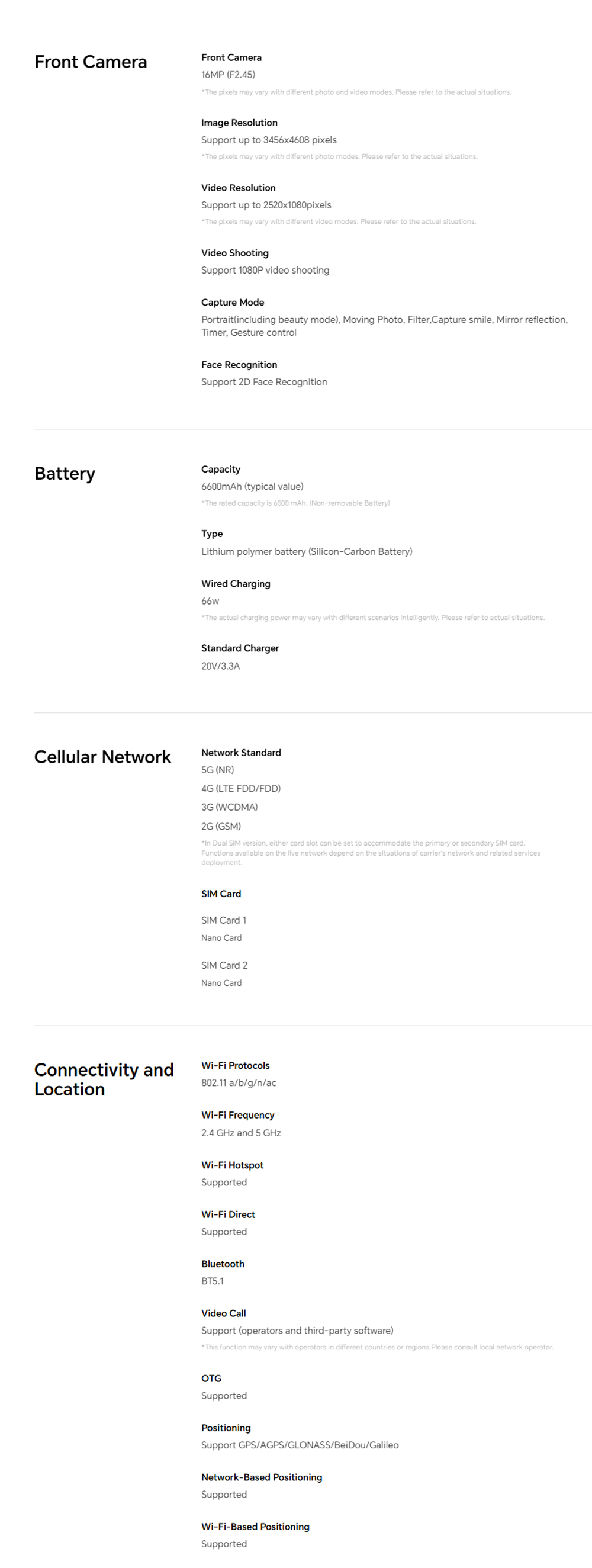 • Battery Capacity(mAh): Li-Po 6600 mAh,Fast charging 66W