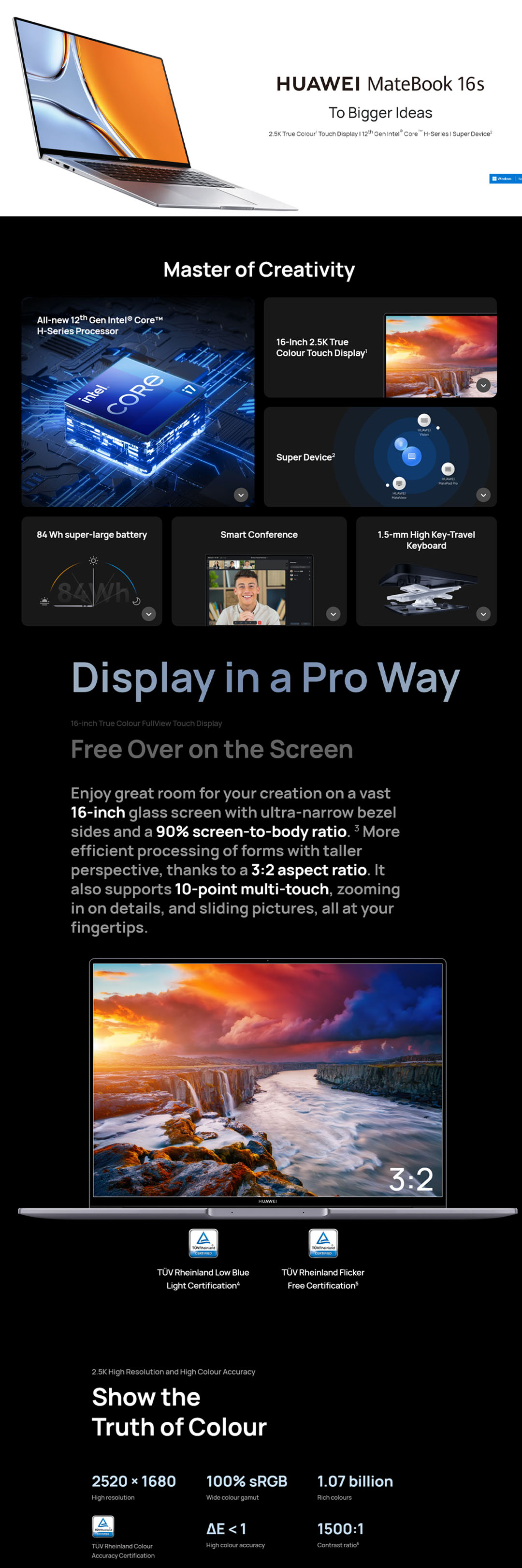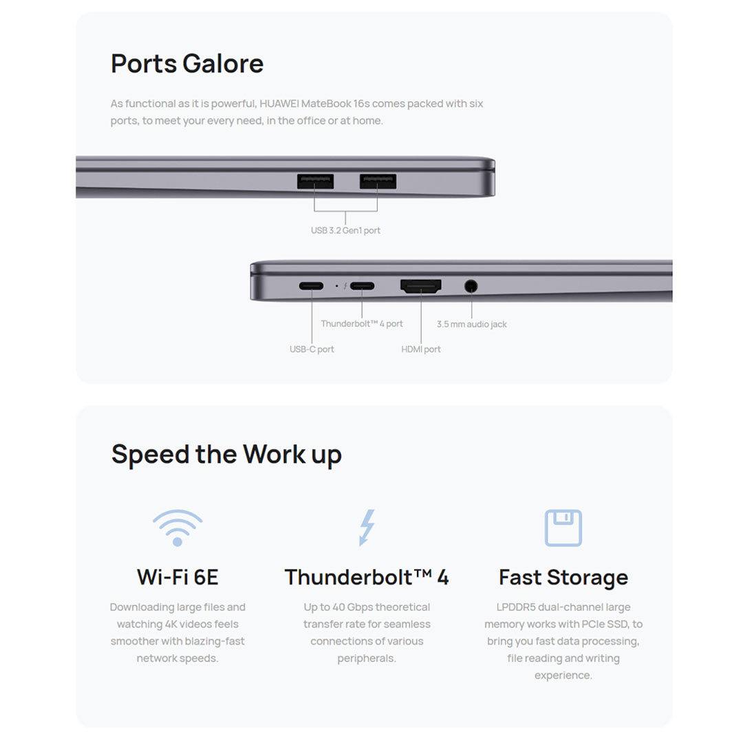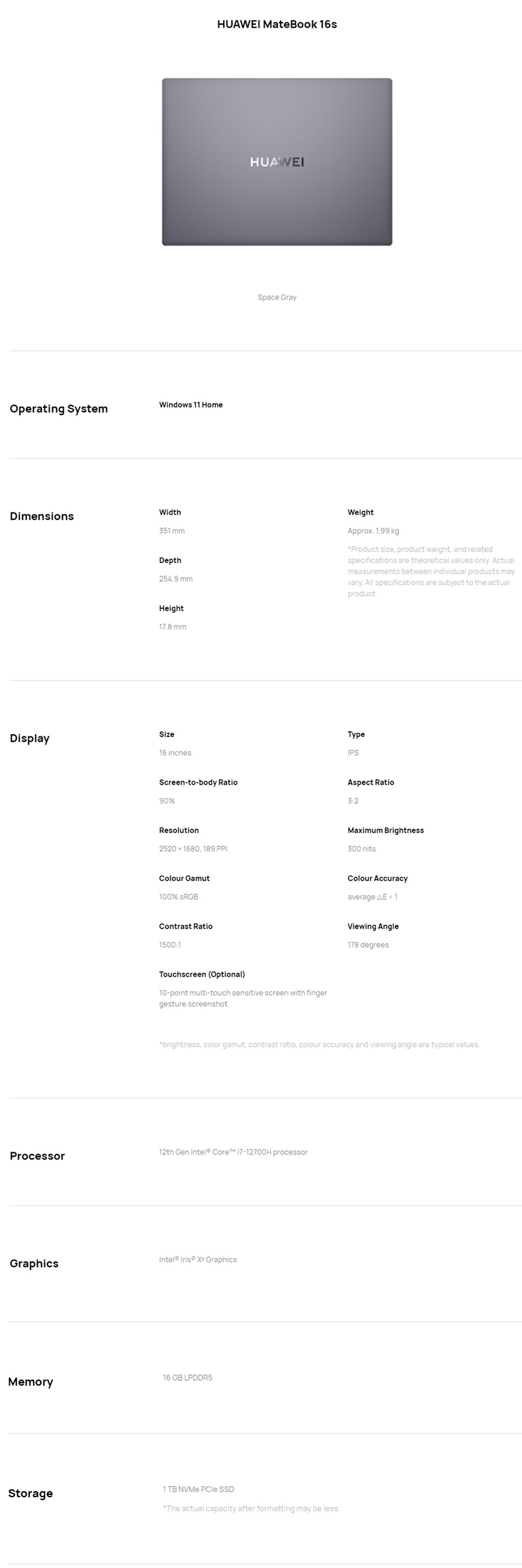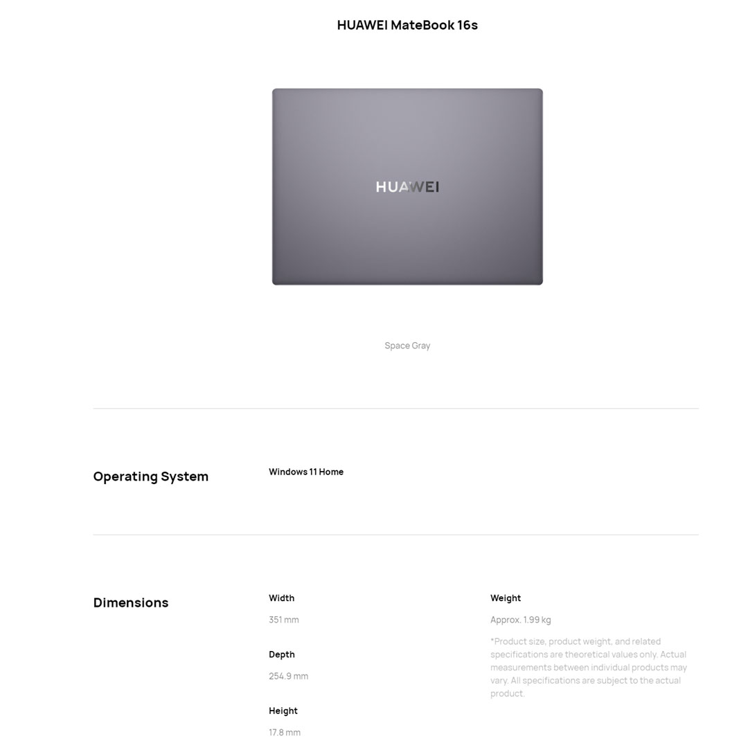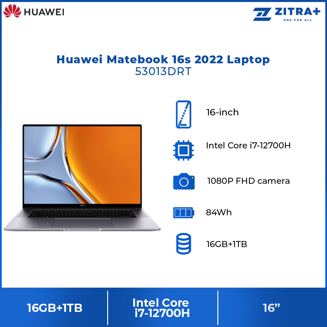 Huawei MateBook 16s 2022 Laptop 53013DRT (Intel Core i7-12700H/ 16GB+1TB SSD/ 16-inch FHD/ W11) | Wi-Fi 6E | Fingerprint Power Button | Window 11 Home | Laptop with 1 Year Warranty