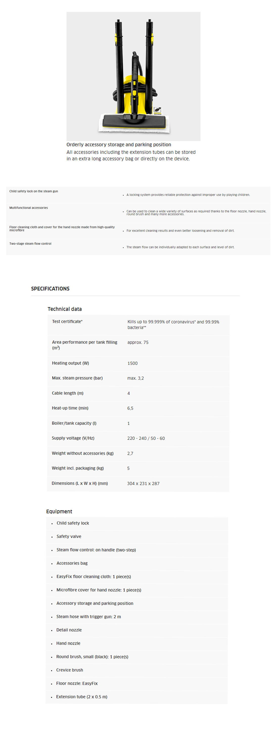 Karcher 1500W Steam Vacuum Cleaners SC 2 Deluxe Easy Fix *SEA | Child Safety Lock | LED Light Display | Safety Valve | Steam Vacuum with 1 Year Warranty