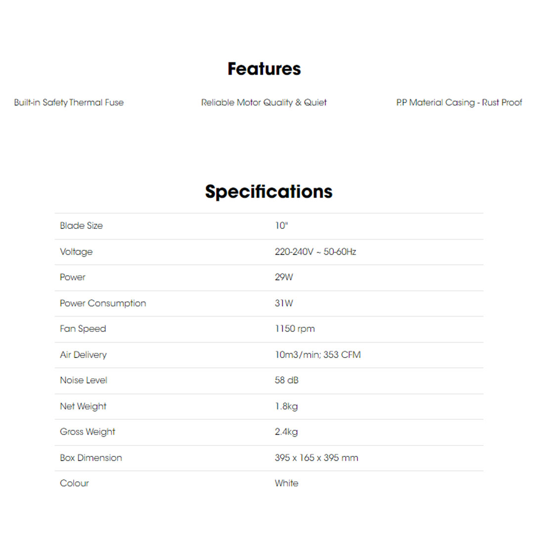 KHIND 10" Ventilation Fan VF100 | Built-in Safety Thermal Fuse | Reliable Motor Quality & Quiet | P.P Material Casing - Rust Proof | Ventilation Fan with 1 Year General Warranty & 3 Years Motor Warranty
