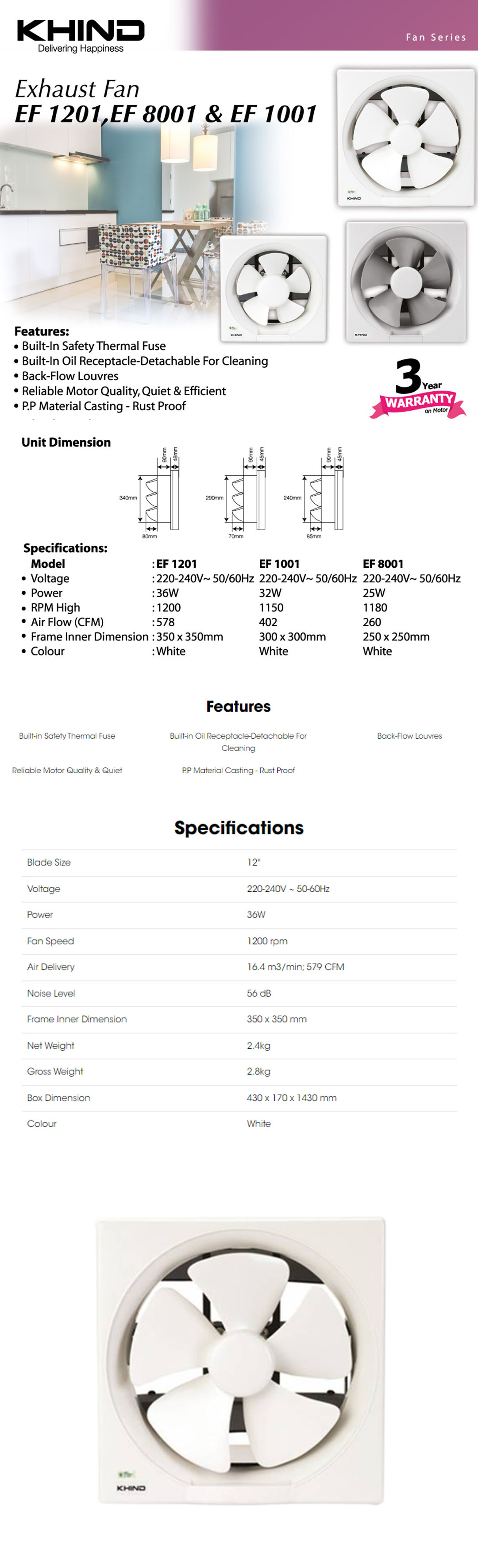 KHIND 12" Exhaust Fan EF1201 | Built-in Safety Thermal Fuse | Back-Flow Louvres | Built-in Oil Receptable-Detachable For Cleaning | Exhaust Fan with 1 Year General Warranty & 3 Years Motor Warranty