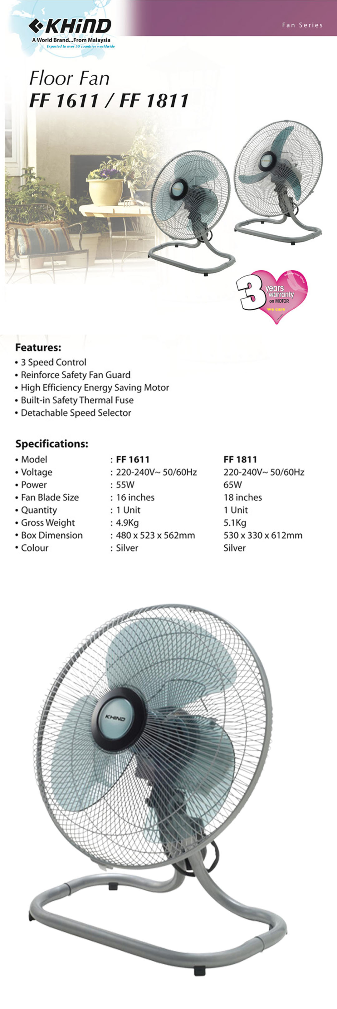 KHIND 16" Floor Fan FF1611 | Built-in Safety Thermal Fuse | High Efficiency Energy Saving Motor | 3 Speed Selection | Detachable Speed Selector | Floor Fan with 1 Year General Warranty & 3 Years Motor Warranty