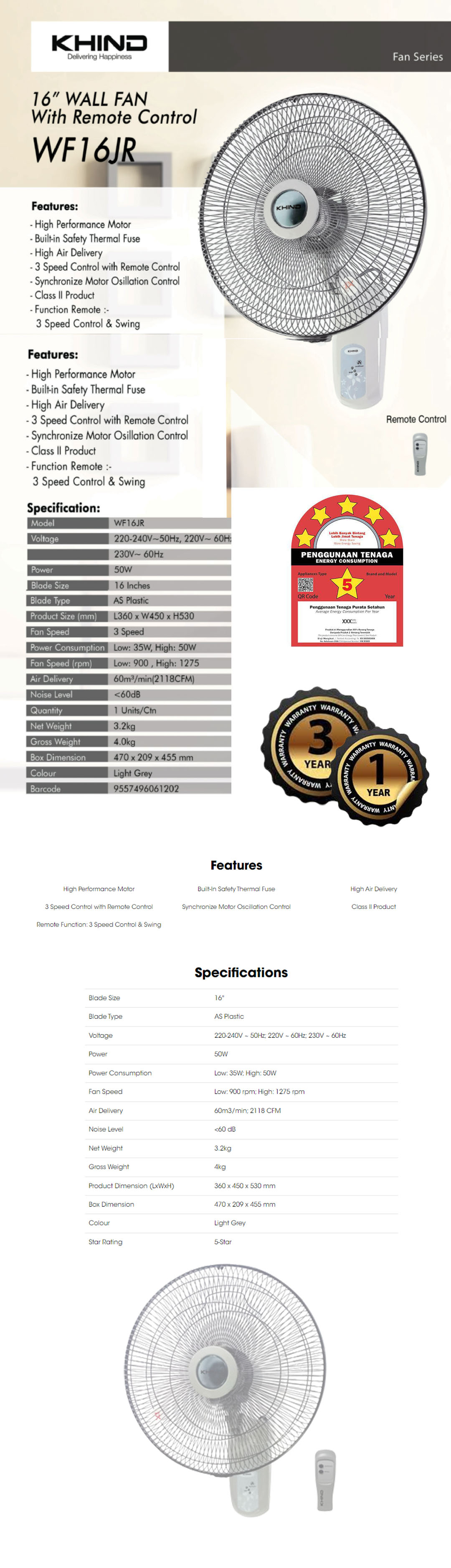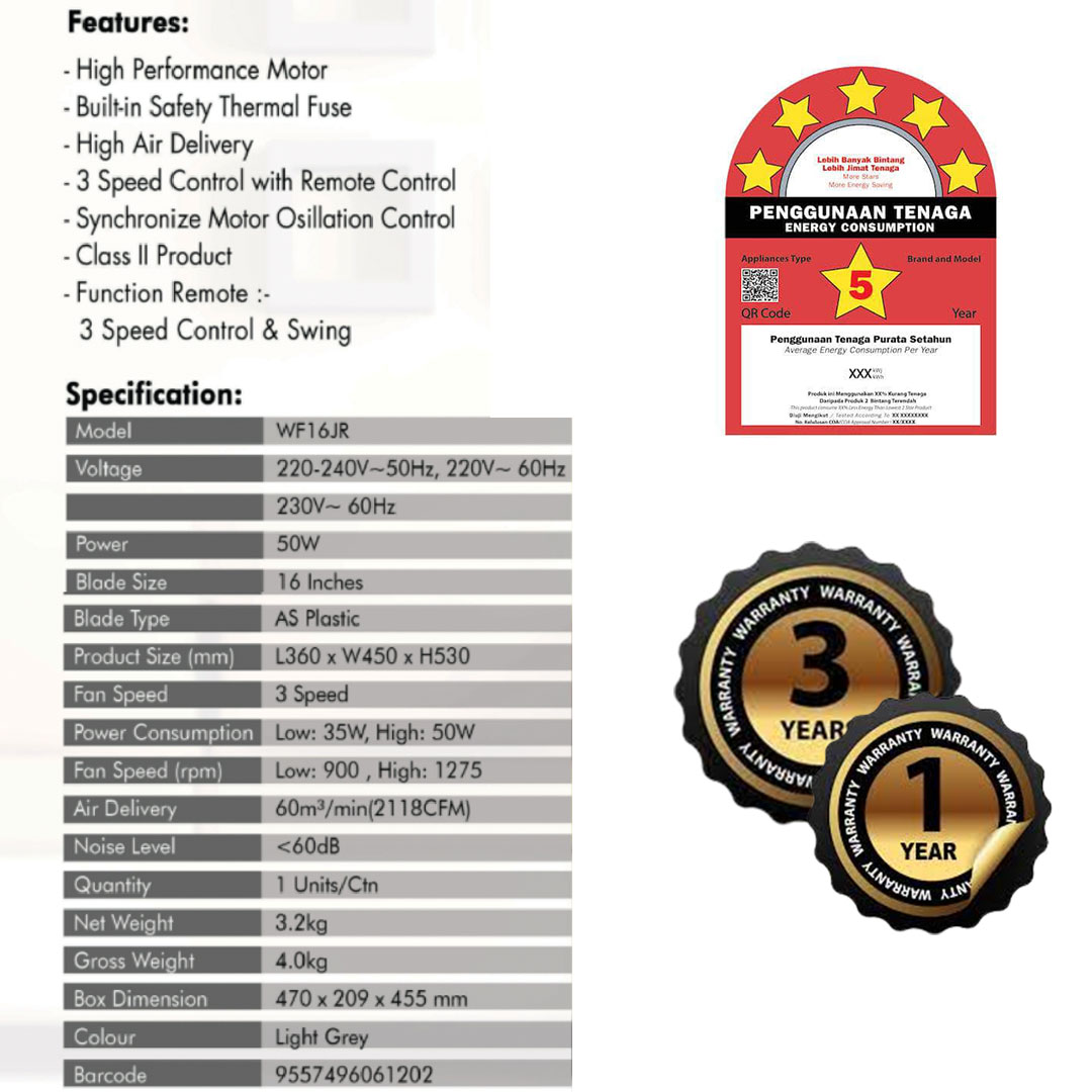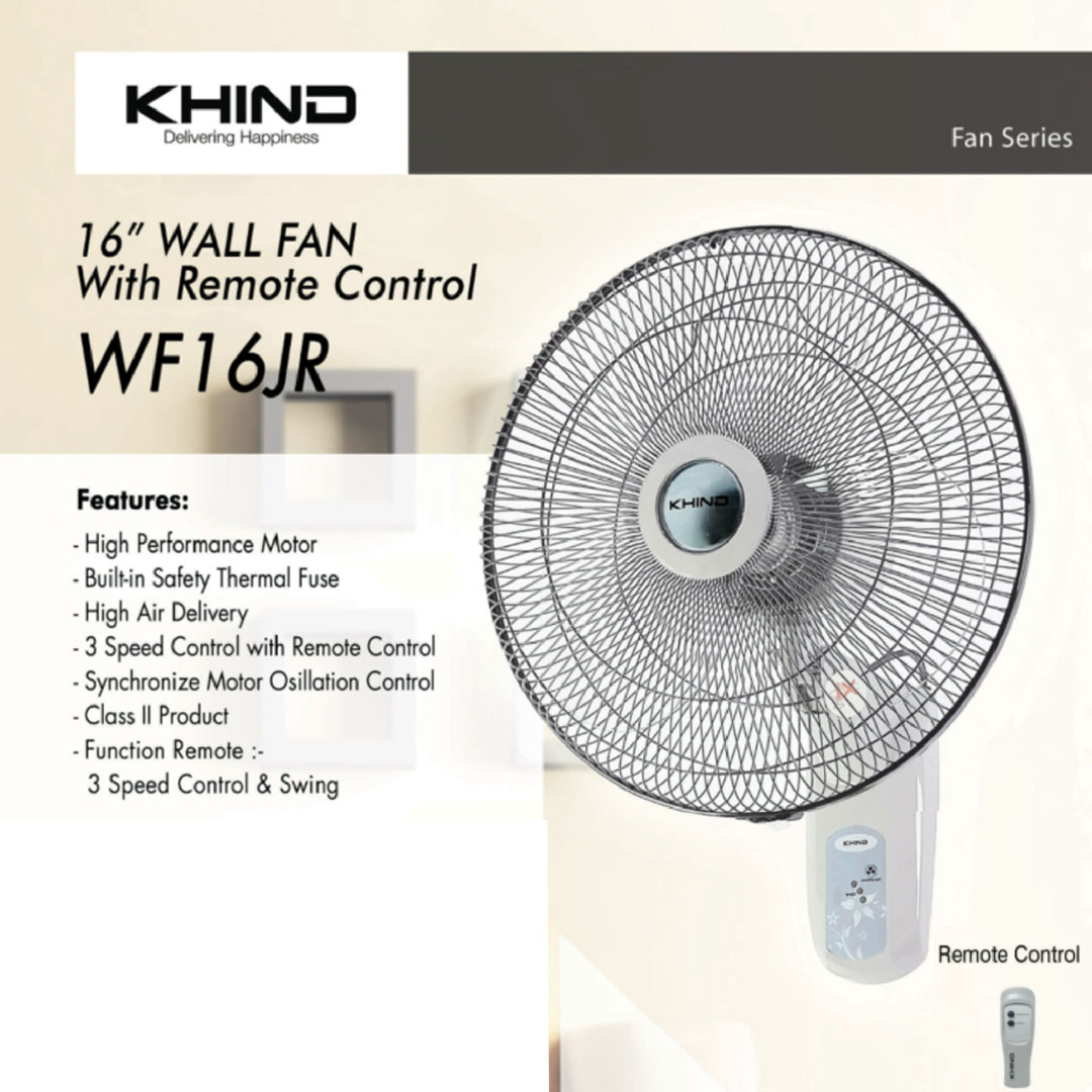 KHIND 16" Remote Wall Fan WF16JR | Built-In Safety Thermal Fuse | 3 Speed Control with Remote Control | Synchronize Motor Oscillation Control | Wall Fan with 1 Year General Warranty & 3 Years Motor Warranty