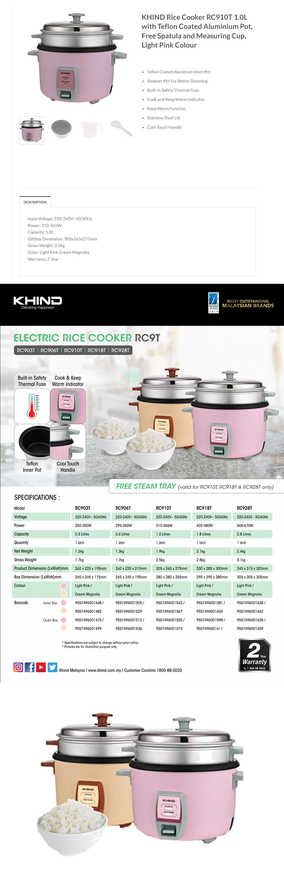 KHIND 1L Electric Rice Cooker RC910T | FREE Steam Tray | Built-in Safety Thermal Fuse | Teflon Inner Pot | Cook & Keep Warm Indicator | Cool Touch Handle | Rice Cooker with 2 Years Warranty