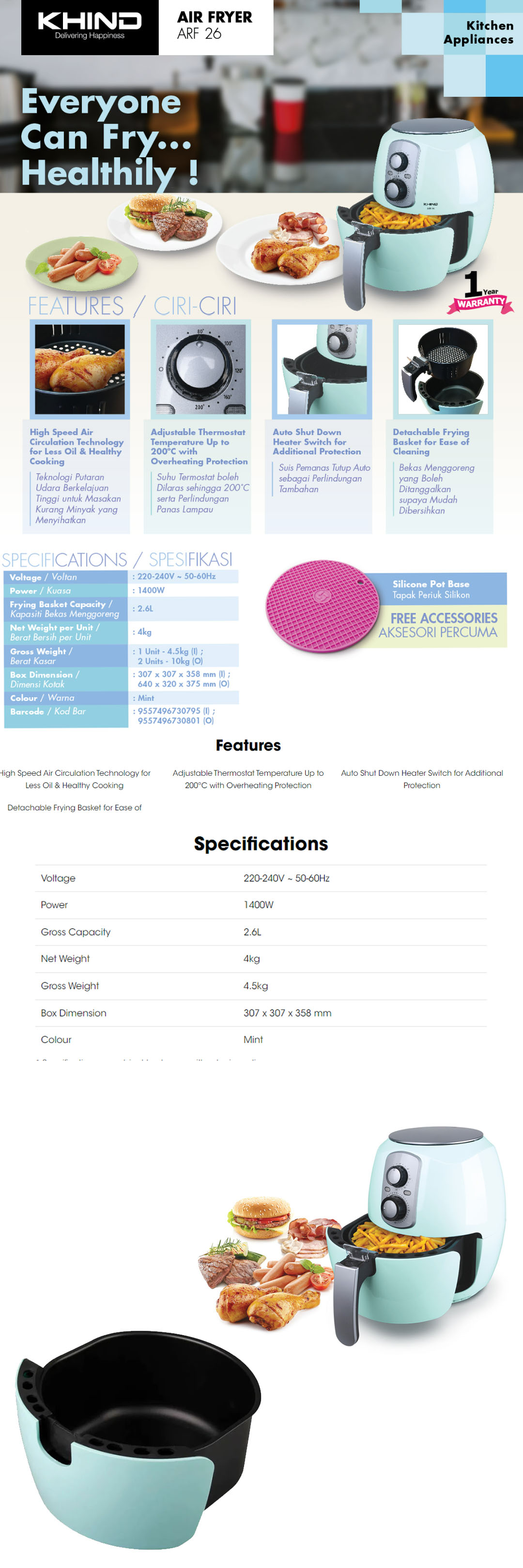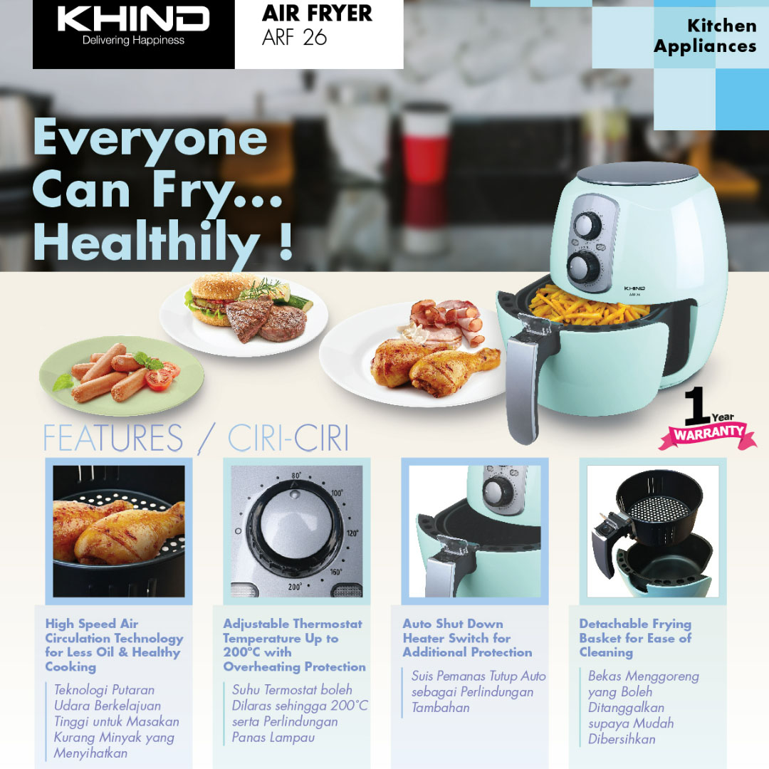KHIND 2.6L Air Fryer ARF26 | Auto Shut Down Heater Switch | Overheating Protection | Detachable Frying Basket | Air Fryer with 1 Year Warranty