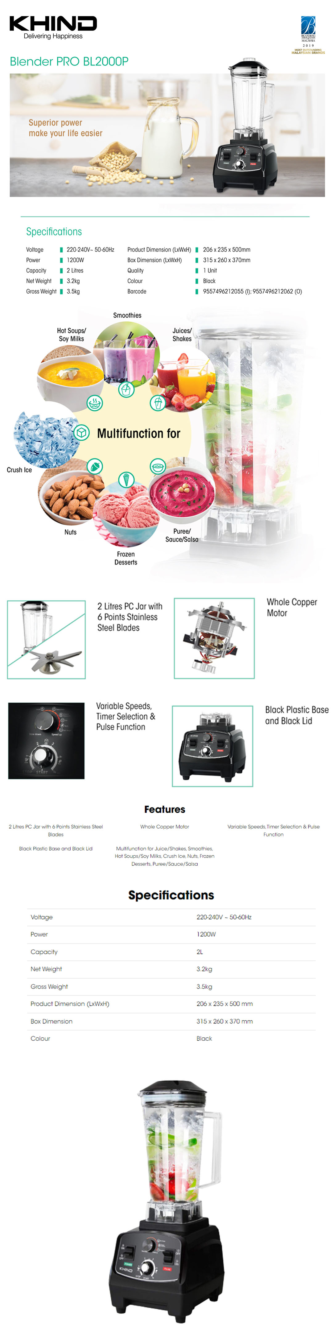 KHIND 2L Multifunction Blender PRO BL2000P | 6 Points Stainless Steel Blades | Pulse Function | Whole Copper Motor | Variable Speeds & Timer Selection | Blender with 1 Year Warranty