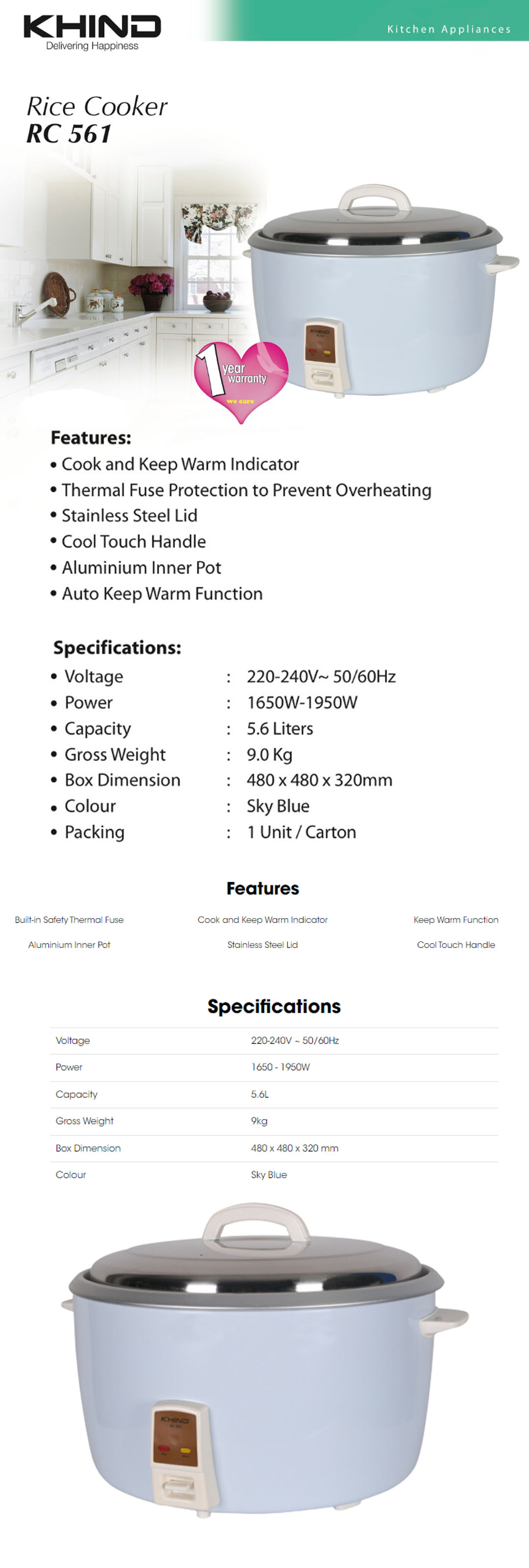 KHIND 5.6L Rice Cooker RC561 | Automatic Keep Warm Function | Built-In Thermal Fuse Protection to Prevent Overheating | Aluminium Inner Pot | Rice Cooker with 1 Year Warranty