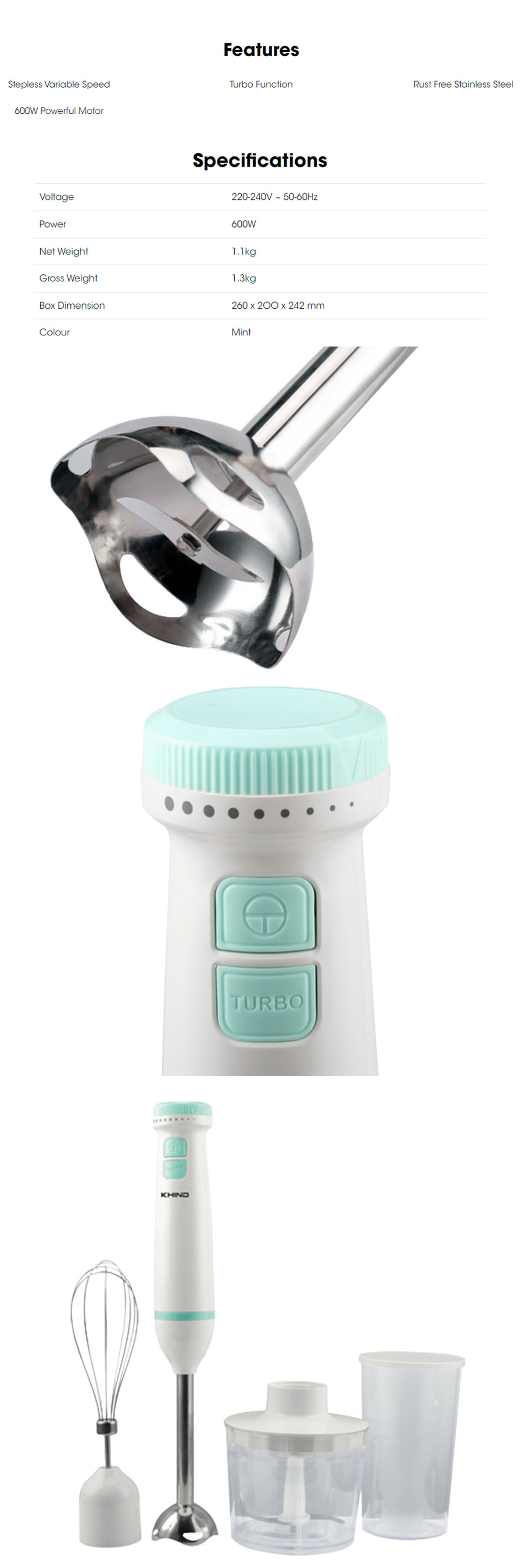 KHIND 600W Hand Blender BH600M | Stepless Variable Speed | Turbo Function | Rust Free Stainless Steel | Hand Blender with 1 Year Warranty