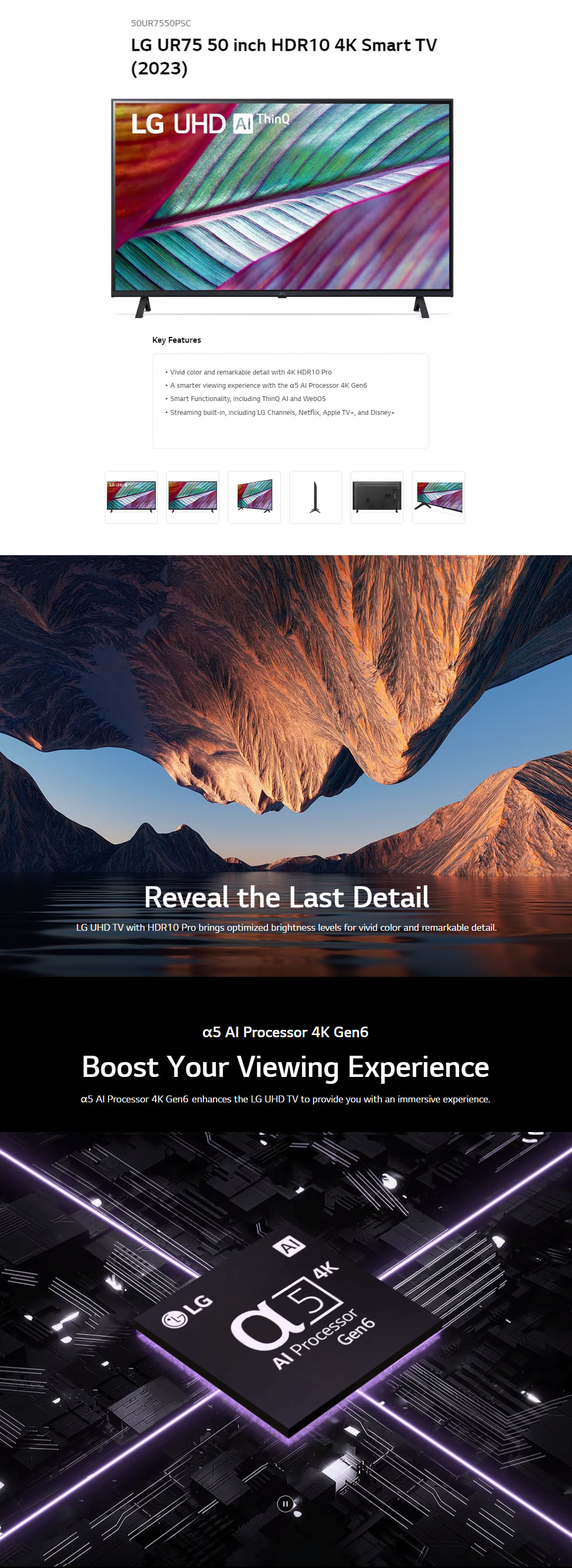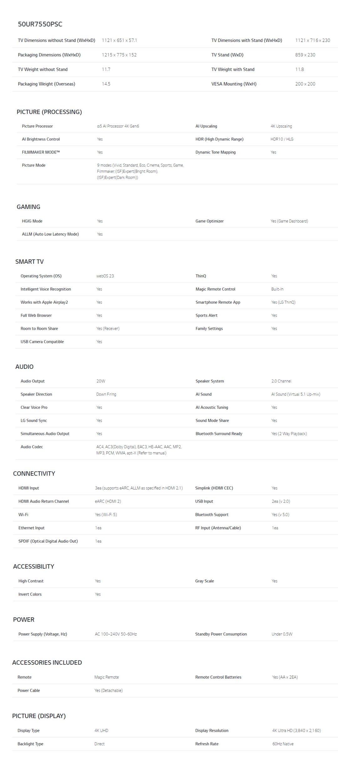LG 50" 4K Smart TV with AI ThinQ 50UR7550PSC | AI Sound | Wi-Fi | Filmmaker Mode | Netflix | Smart TV with 2 Year Warranty