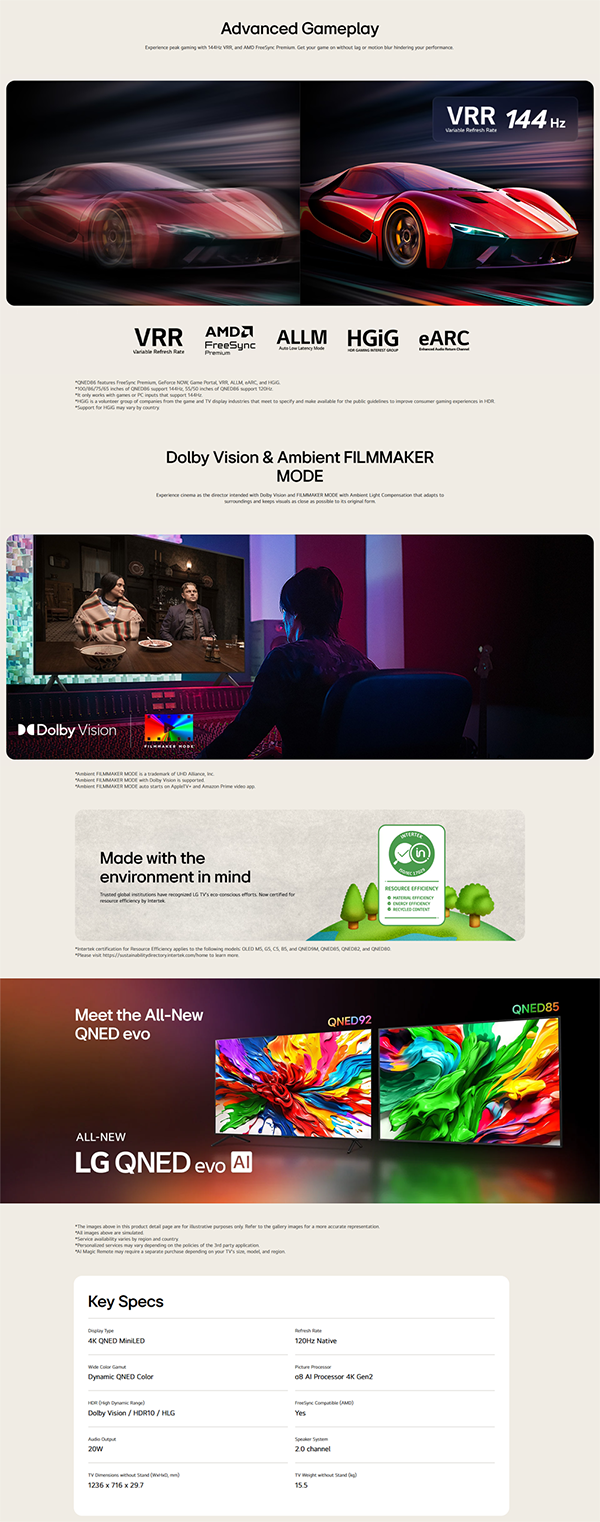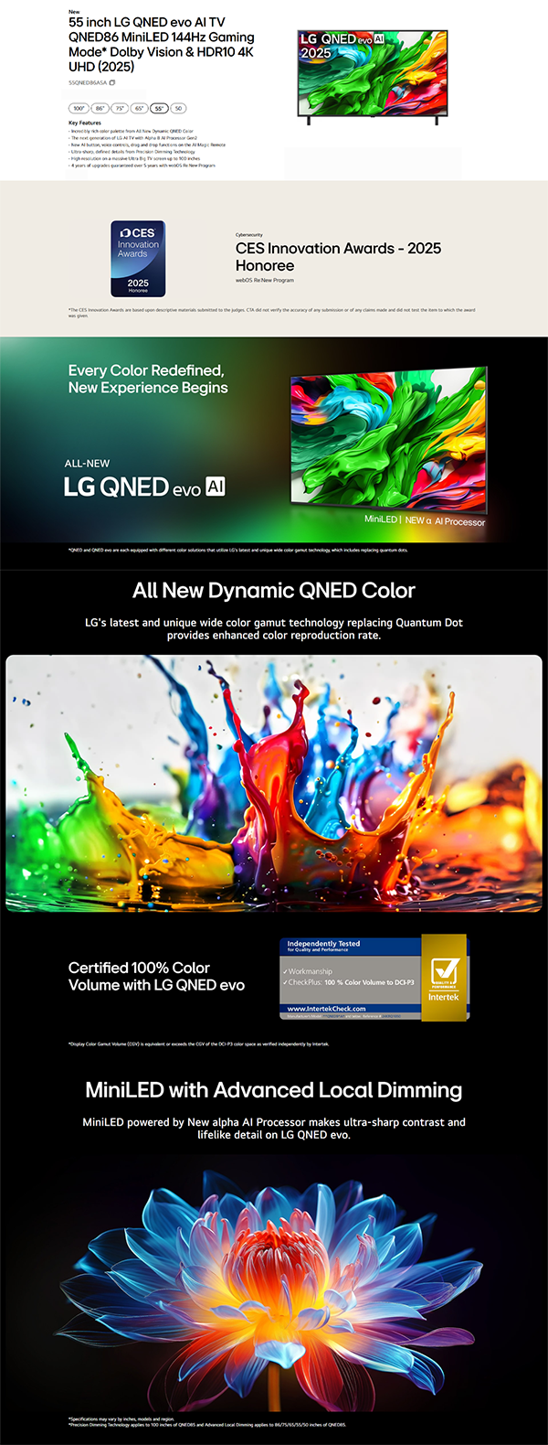 LG 55"/65"/75"/86" 4K UHD QNED evo AI MiniLED Smart TV QNED86AS | Alpha 8 AI Processor Gen2 | Dynamic QNED Colour | Dolby Vision / HDR10 / HLG