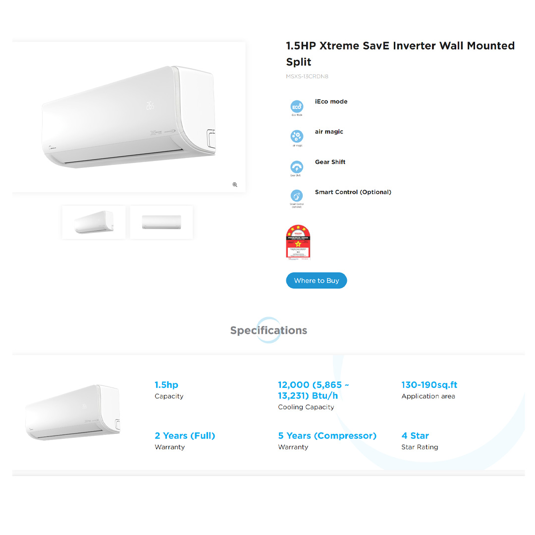Midea 1.5HP R32 Xtreme SavE Inverter Wall Mounted Split Air Conditioner MSXS-13CRDN8 | iEco Mode | Air Magic | Gear Shift | Smart Control Low Noise | Air Conditioner with 1 Year Warranty