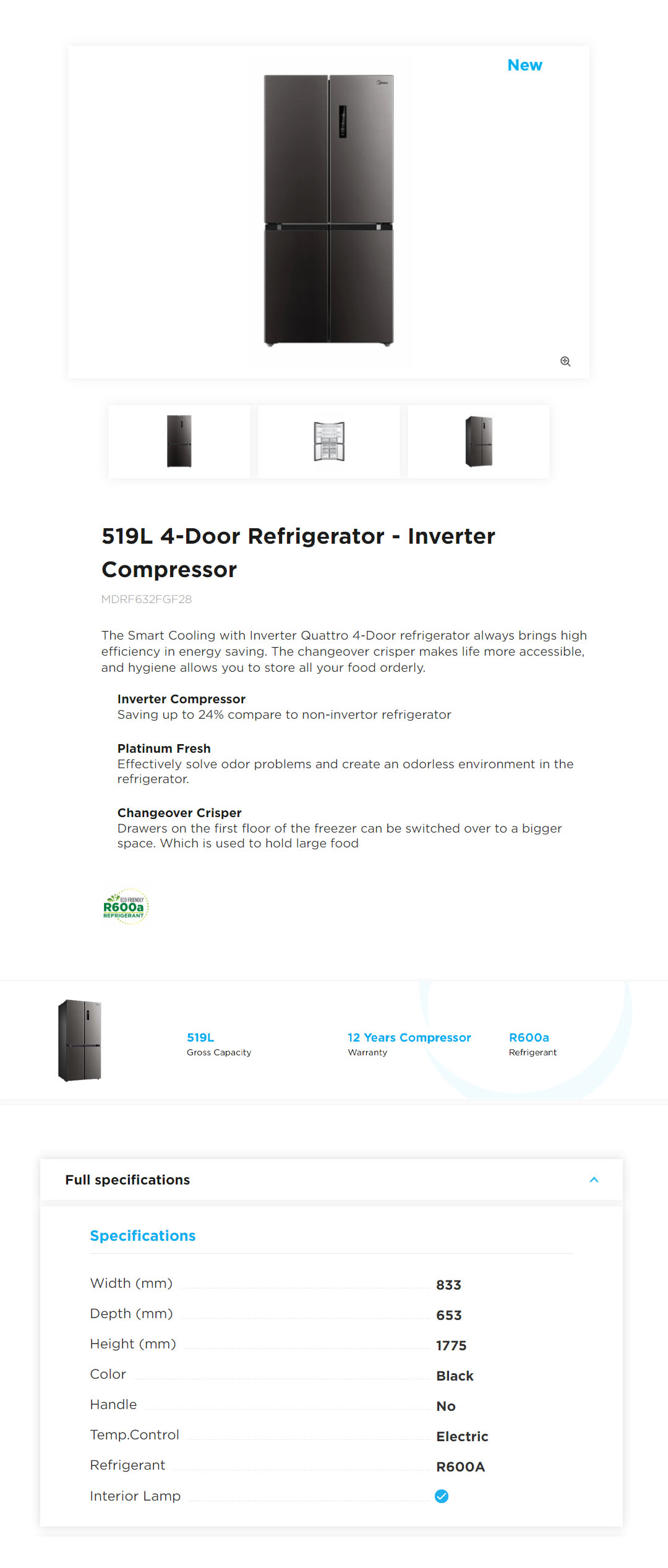 Midea 519L Multi Doors Inverter Refrigerator MDRF632FGF28 | Inverter Compressor | Multi Air Flow System | Platinum Fresh | LED Display Control | Interior LED Light | Refrigerators with 1 Year Warranty