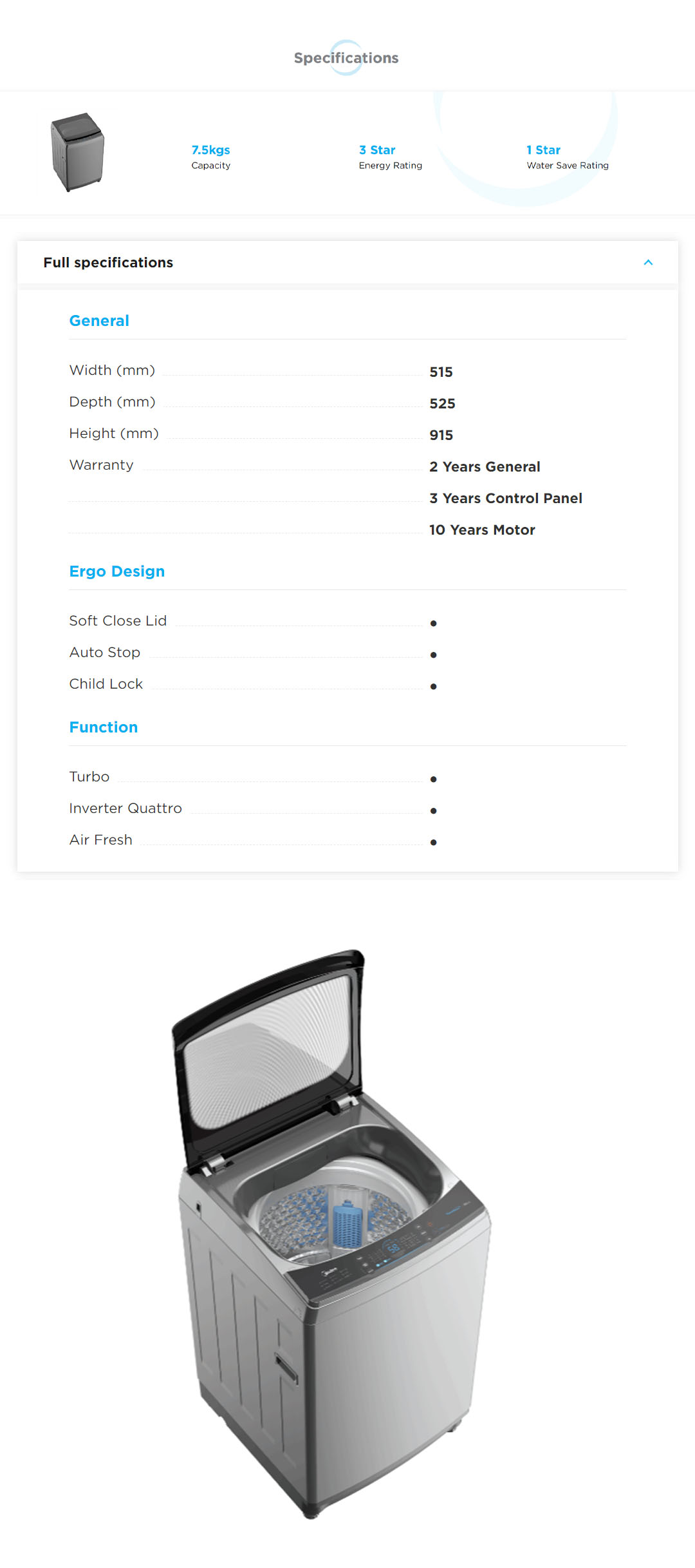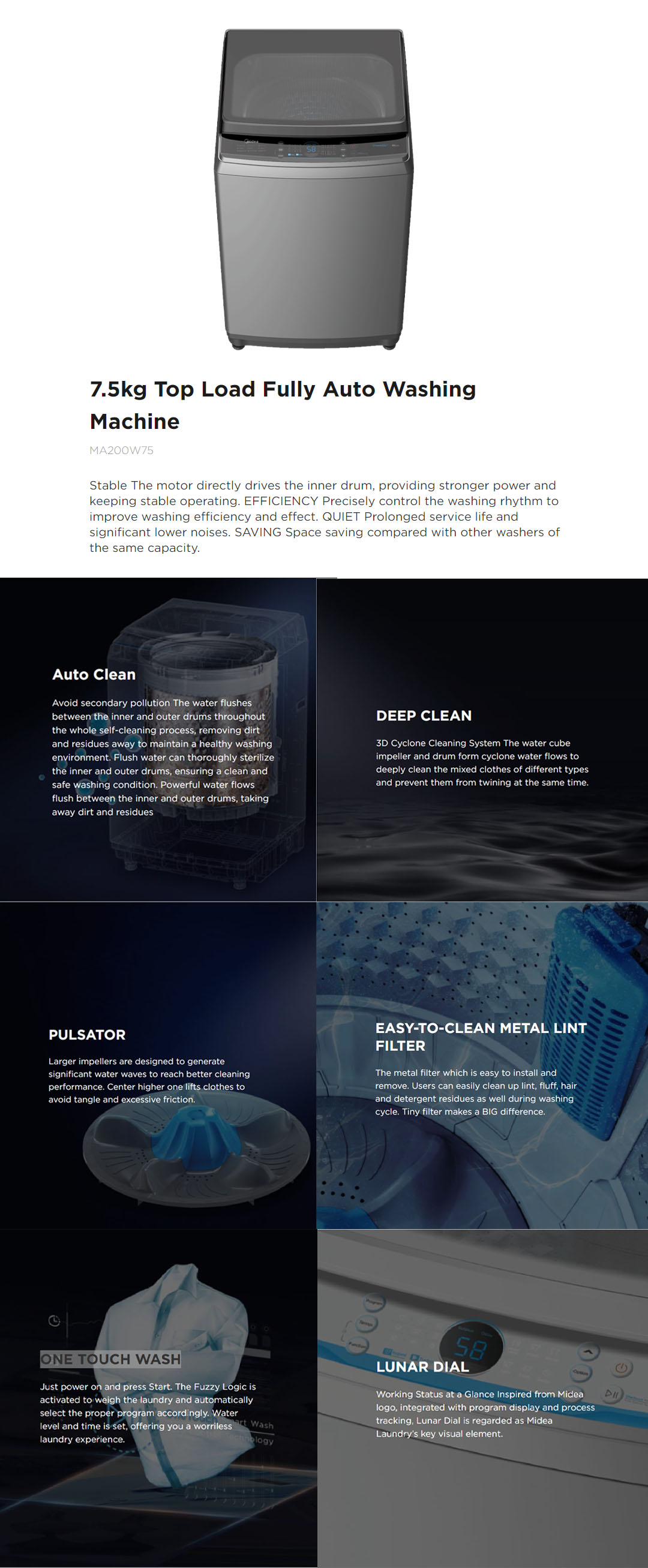 Midea 7.5KG Top Load Washing Machine MA200W75 | AirFresh | Soft Close Lid | Auto Stop | One-Touch Smart Wash | Child Lock | Auto Clean | Hygiene+ | Deep Clean | Turbo | Lunar Dial | Washing Machine with 2 Year Warranty