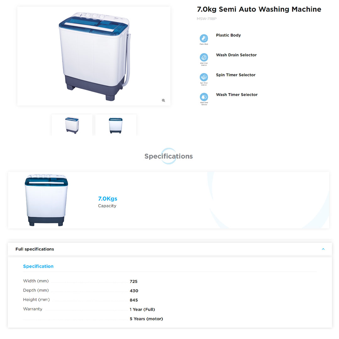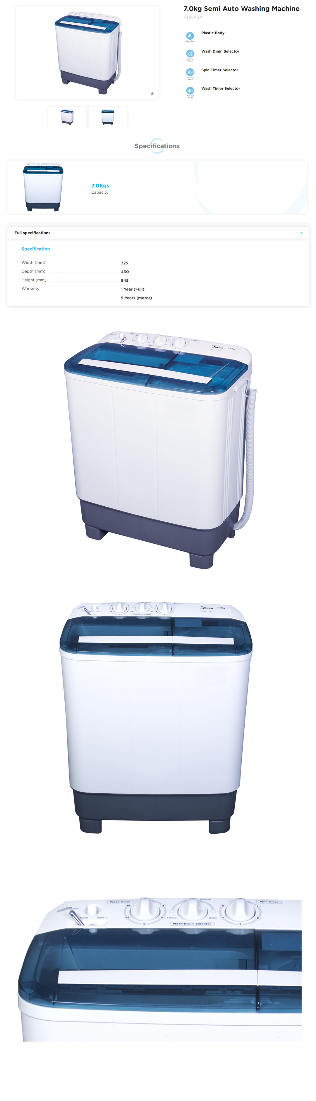 Midea 7KG Semi Auto Washing Machine MSW-7118P | Wash Drain Selector | Wash Timer Selector | Spin Timer Selector | Fibre Body | Washing Machine with 1 Year Warranty